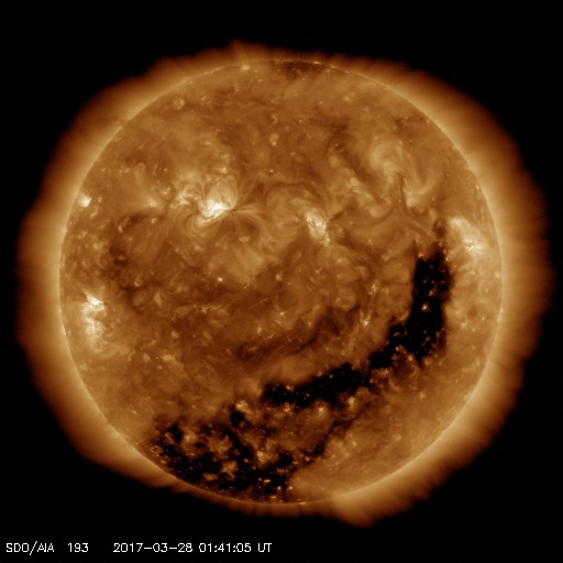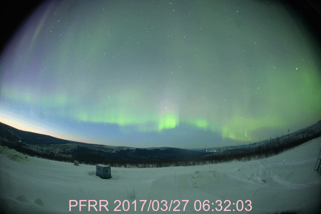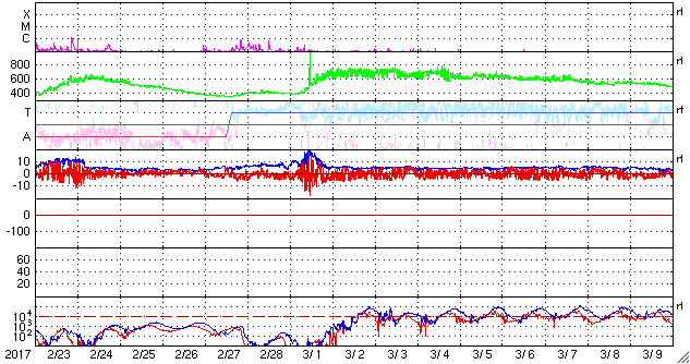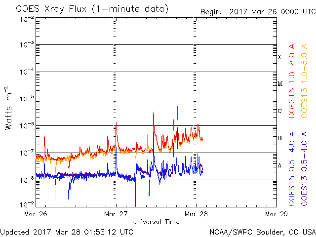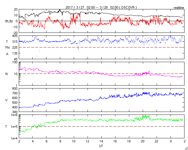2017/ 3/28 10:53 更新 太陽風の速度は650km/秒に高まり、磁気圏も活動的です。C5の小規模フレアが発生しています。 担当 篠原 昨日のニュースのすぐ後、太陽風の磁場強度は15nTへ強まり、 速度も上昇を続けて、 昨夕、27日17時(世界時27日8時)には500km/秒を超えて高速風になり、 今朝、28日5時(世界時27日20時)には、700km/秒まで高まりました。 以降は少し下げて、650km/秒とかなり高い速さで安定しています。 磁場強度は、現在は6nTと平均的な値に戻っています。 太陽風磁場の南北成分は、 -5〜 -10nTに達する南向きの変化が頻繁に発生しています。 速度の高まりもあり、磁気圏の活動はとても活発になっています。 オーロラの活動度を示すAE指数のグラフは、 1000〜1500nTに達する激しい変化が繰り返し発生しています。 アラスカ・フェアバンクスのオーロラカメラでは、 日没から日の出まで7時間にわたって オーロラの見事な躍動が撮影されています。 ファイルサイズが大きくなっていますが、動画をどうぞご覧下さい。 27日周期の図を参照すると、 高速太陽風の到来は、前周期よりも1日早まっています。 前周期の高速風は、3月10日まで9日間にわたって継続しました。 今回はどこまで続くでしょうか。 今後の推移に注目してください。 太陽のフレアも活発になっています。 昨日のニュースの後、太陽の南東部(左下)に新しく2645黒点群が発生しました。 出現とともに活発にフレアを起こし、 27日20時(世界時27日11時)にC3.2、 28日2時(世界時27日17時)にC1.6、 28日3時(世界時27日18時)にC5.1と、 Cクラスの小規模フレアを3回起こしています。 C5を超えるフレアの発生は、1月21日のC6.1以来で、 およそ2か月ぶりです。 X線のグラフも、全体の強度が高まっています。 2644黒点群とともに、引き続き注目して下さい。