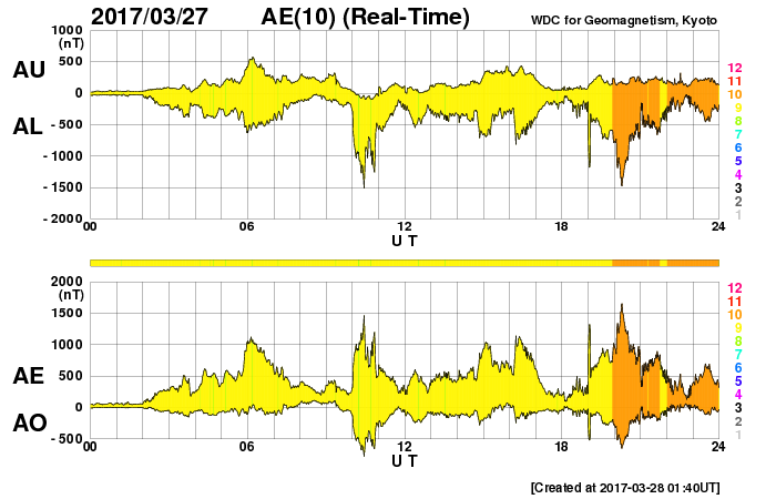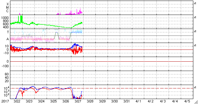 (c) 情報通信研究機構、(動画加工 : 宇宙天気ニュース) ![]() 世界時3月27日のAE指数(速報値)。 (c) 京都大学WDC ![]() SDO衛星のAIA193カメラによる太陽コロナの様子 (c) SDO (NASA) ![]() SDO衛星による太陽の可視光写真。マウスの矢印を写真に重ねると、黒点番号付きの写真に切り替わります。 (c) SDO (NASA) ![]() DSCOVRが観測した太陽風の磁場(1番上の枠、黒線は全体の強度、赤線は南北成分) および、太陽風の密度(3番目の紫線)、速度(4番目の青線) (c) データ:NOAA/SWPC、作図:宇宙天気ニュース ![]() 27日の太陽周期に合わせたデータプロット 太陽が同じ面を地球に向けていた27日前の変化から、今後を予想することができます。 (c) 作図:宇宙天気ニュース