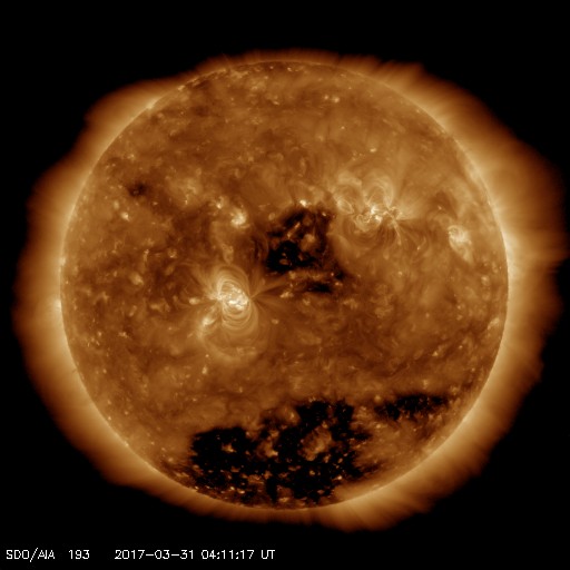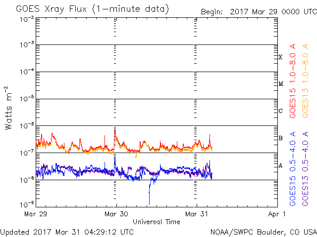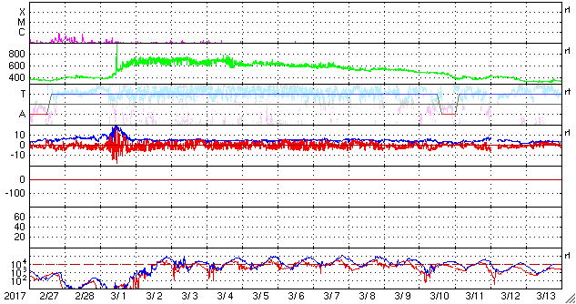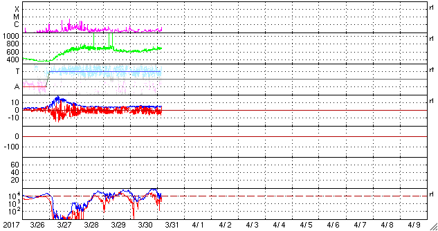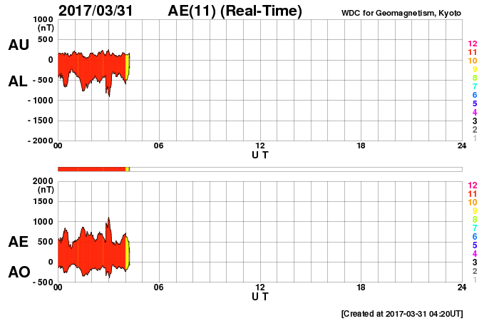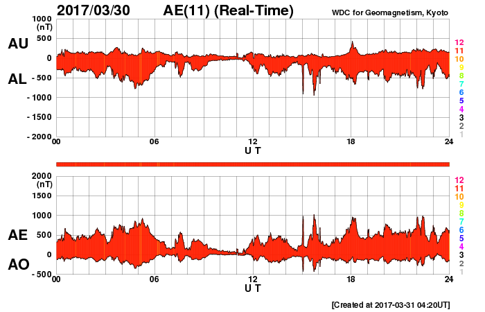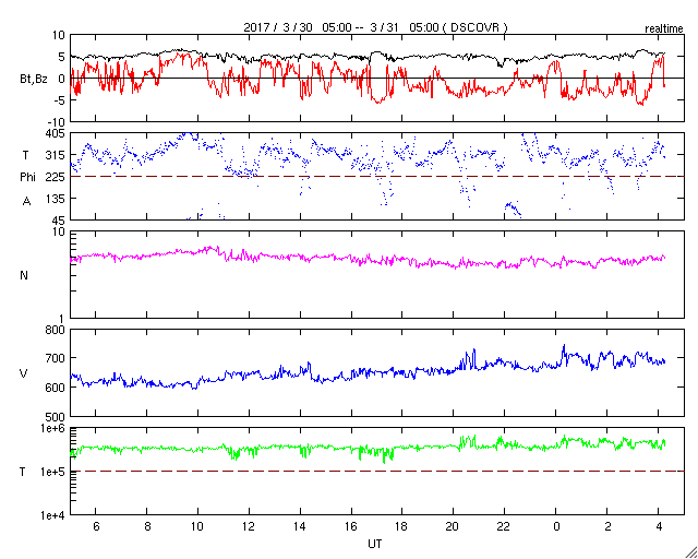 2017/ 3/31 13:29 更新 太陽風の速度は700km/秒に再び高まっています。磁気圏の活動も活発です。 担当 篠原 600km/秒近くに下がっていた太陽風の速度は、 再びゆっくりと上昇を始め、700km/秒に戻っています。 磁場強度は、5nTと平均的な値で安定しています。 27日に始まった高速太陽風は、 4日にわたってかなり高い速度を保っています。 太陽風磁場の南北成分は、南寄りの変化をしています。 このため、磁気圏の活動も連続的に高まっていて、 AE指数のグラフは、500〜1000nTの中規模の変化が続いています。 極域では、オーロラの活動がにぎやかに発生しているようです。 27日周期の図の前周期の太陽風は、3月10日まで高速の風が続いています。 今回も高速風はしばらく続きそうです。 SDO衛星AIA193の太陽写真では、 新しく現れたコロナホールが太陽の中央部に広がり、 南極付近のコロナホールも、より低緯度側に拡大しています。 太陽では、2644黒点群と2645黒点群が大きな姿を保っています。 中央側の2645黒点群のこの2日間の変化を、 SDO衛星可視光写真の動画で紹介します。 X線のグラフでは、Bクラスの小さいフレアが続いています。 再び、Cクラスに達する活動は発生するでしょうか。 引き続き注目してください。 放射線帯の高エネルギー電子は、 GOES15(青線)が、10万近くまで高まっています。 高速の太陽風が続いているので、更に高まるかもしれません。 ![]() 29日以降の2645黒点群の変化。SDO衛星。 (c) SDO (NASA)、(動画加工 : 宇宙天気ニュース) ![]() 世界時3月30日のAE指数(速報値)。 (c) 京都大学WDC ![]() 世界時3月31日のAE指数(速報値)。 (c) 京都大学WDC ![]() SDO衛星のAIA193カメラによる太陽コロナの様子 (c) SDO (NASA) ![]() SDO衛星による太陽の可視光写真。マウスの矢印を写真に重ねると、黒点番号付きの写真に切り替わります。 (c) SDO (NASA) ![]() DSCOVRが観測した太陽風の磁場(1番上の枠、黒線は全体の強度、赤線は南北成分) および、太陽風の密度(3番目の紫線)、速度(4番目の青線) (c) データ:NOAA/SWPC、作図:宇宙天気ニュース ![]() 27日の太陽周期に合わせたデータプロット 太陽が同じ面を地球に向けていた27日前の変化から、今後を予想することができます。 (c) 作図:宇宙天気ニュース