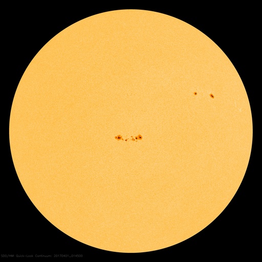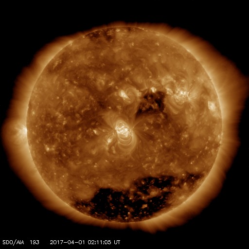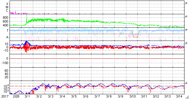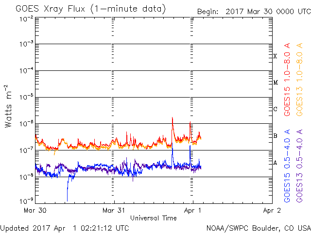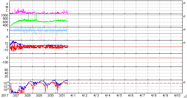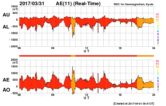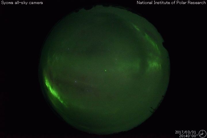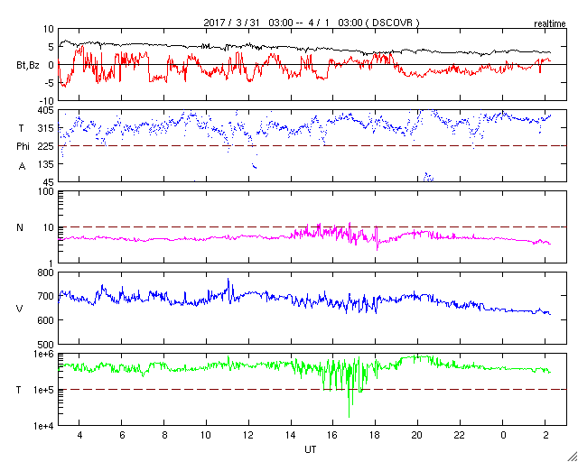 2017/ 4/ 1 11:21 更新 高速太陽風が続き、磁気圏の活動も活発です。C1の小規模フレアが発生しています。 担当 篠原 太陽風の速度は、今日の早朝まで700km/秒近くを保っていましたが、 その後少し低下して、現在は630km/秒です。 依然、かなり高い速度が続いています。 太陽風の磁場強度は、5nTから3nTへやや弱まっています。 高速の太陽風は、これから次第に弱まっていくのか、 太陽の中央部に発生したコロナホールの影響で再び強まるのか、 注目して下さい。 太陽風磁場の南北成分は、南北両方に変化しています。 このため、磁気圏の活動は高まった状態が続き、 AE指数は、500〜1000nTと活発な変化が続き、 最高では1500nTにも達しています。 南極・昭和基地の全天カメラで撮影された、 世界時31日20時半〜21時のオーロラを動画で紹介します。 AE指数のグラフの最後の高まりの少し前にあたる時間帯で、 指数としてはまだ高まっていませんが、 昭和基地の上空では既に激しいオーロラが発生していたようです。 太陽は、2645黒点群で、 C1.7、C1.1と2つの小規模フレアが発生しています。 また、中央部に2647黒点群が発生しています。 放射線帯の高エネルギー電子は、 10,000を超えて高まった状態が続いています。 値としては昨日と同程度で、増加は止まっているようです。