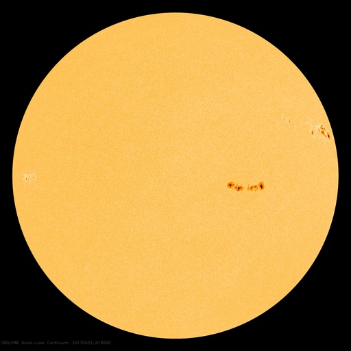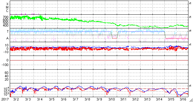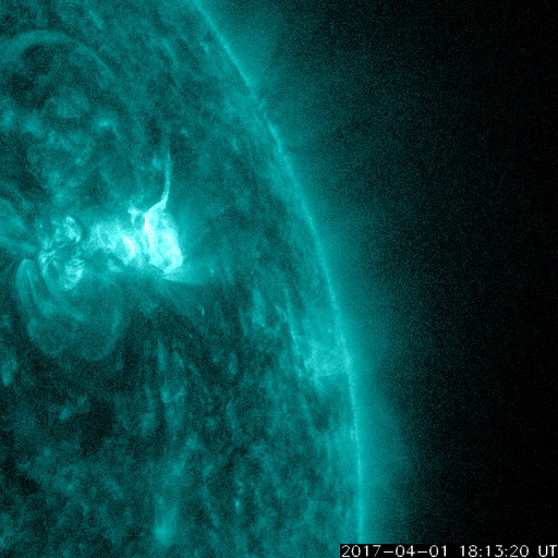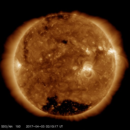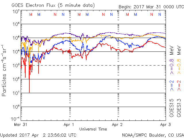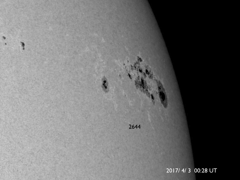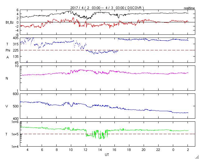 2017/ 4/ 3 11:20 更新 M5.3、M5.7など、2644黒点群で中規模フレアが5回発生しています。 担当 篠原 2644黒点群の活発な活動が続いています。 昨日の朝に発生したM4.4に続いて、 夕方、2日17時(世界時2日8時)にM5.3、 夜遅く、3日22時(世界時2日13時)にM2.3、 今日未明、3日3時(世界時2日18時)にM2.1、 そして、今日の早朝、3日5時半(世界時2日20時半)には、 M5.7と今回の活動の高まりで最大のX線強度のフレアが発生しました。 そして、先ほど、3日10時(世界時3日1時)にも、M1.2のフレアが起きています。 最初のMクラスフレアであるM4.4以降の2644群の活動の様子を、 SDO衛星AIA131による動画で掲載します。 激しい輝きが次々と発生しています。 また、2644黒点群の現在の様子を、 SDO衛星の可視光写真を拡大して掲載します。 黒点群は太陽の西の端に近づいていて、この後見えなくなりそうです。 これらのMクラスフレアに伴って、 CME(太陽ガスの放出現象)も発生しています。 SOHO衛星の写真が揃っていなかったので、 STEREO Ahead衛星のCOR2カメラの動画を掲載します。 太陽の向こう側から撮影しているため、 動画の中ではCMEは左向きに噴出しています。 この動画によると、 昨日紹介した最初のCMEが最も激しく噴出しているように見えます。 いずれも地球に対して横方向に噴き出しているので、影響はないでしょう。 太陽の可視光写真では、2645黒点群も大きな姿を見せていて、 昨日の午前中に、C5.1、C8.0と大きいCクラスのフレアを起こしています。 NOAAの報告では、磁場の構造も複雑になっていて、 活発な活動を起こす可能性があります。 こちらのフレアにも注目して下さい。 太陽風は450km/秒へ速度が下がり、やや高速の状態です。 磁場強度は、3nTから4nTへ少し上がっています。 27日周期の図で前周期の太陽風と比較すると、 今回は早い段階で速度が下がっています。 太陽風磁場の南北成分は、0nT付近で小さく変化する程度です。 速度が下がってきたこともあり、磁気圏の活動は小さくなっていて、 AE指数は300nT前後の変化に留まっています。 高速の太陽風はこれで終わって、 しばらく穏やかな状態が続くのでしょうか。 放射線帯の高エネルギー電子は、 GOES15(青線)が10万を超えていて、強まった状態が続いています。