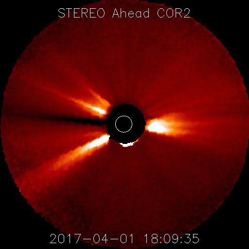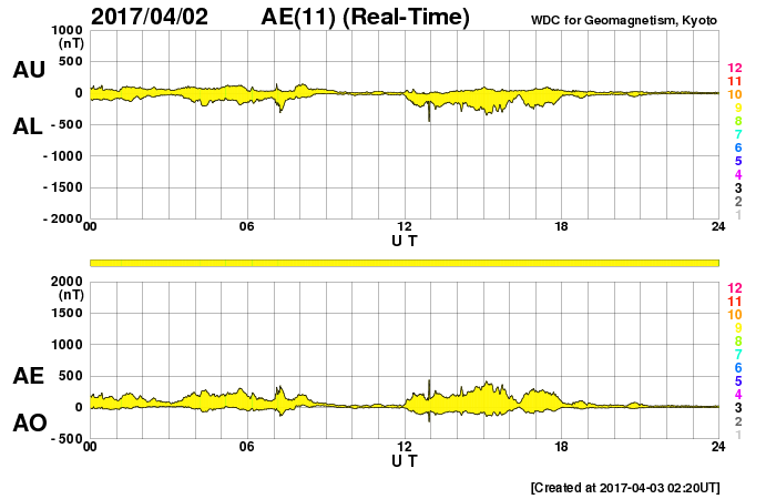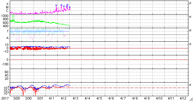 (c) SDO (NASA)、(動画加工 : 宇宙天気ニュース) ![]() 2644黒点群の拡大写真。SDO衛星。 (c) SDO (NASA)、作図:宇宙天気ニュース ![]() STEREO Ahead衛星COR2カメラによる、Mフレアに伴うCMEの様子。 (c) STEREO (NASA)、 (動画加工 : 宇宙天気ニュース) ![]() 世界時4月2日のAE指数(速報値)。 (c) 京都大学WDC ![]() SDO衛星のAIA193カメラによる太陽コロナの様子 (c) SDO (NASA) ![]() SDO衛星による太陽の可視光写真。マウスの矢印を写真に重ねると、黒点番号付きの写真に切り替わります。 (c) SDO (NASA) ![]() GOES衛星の太陽X線データ (c) NOAA/SWPC ![]() DSCOVRが観測した太陽風の磁場(1番上の枠、黒線は全体の強度、赤線は南北成分) および、太陽風の密度(3番目の紫線)、速度(4番目の青線) (c) データ:NOAA/SWPC、作図:宇宙天気ニュース ![]() 27日の太陽周期に合わせたデータプロット 太陽が同じ面を地球に向けていた27日前の変化から、今後を予想することができます。 (c) 作図:宇宙天気ニュース