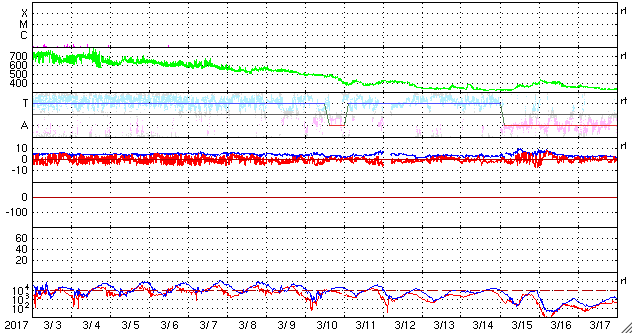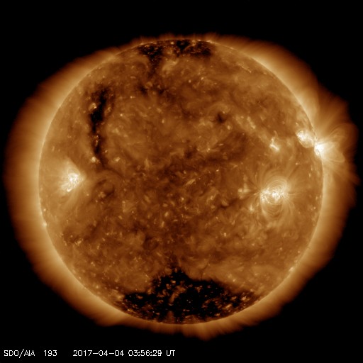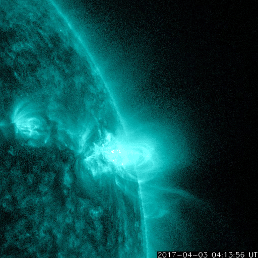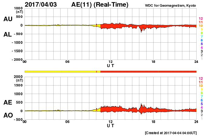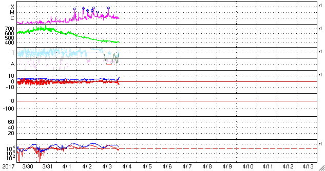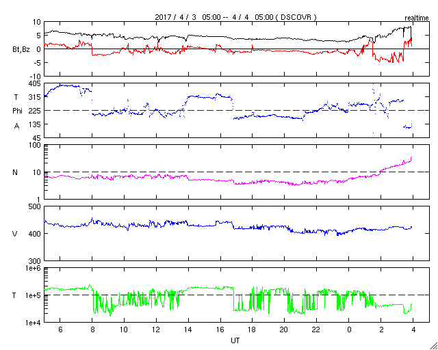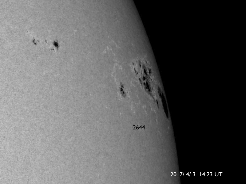 2017/ 4/ 4 13:06 更新 M5.8の中規模フレアが発生しました。2644黒点群は西端に沈みかけています。 担当 篠原 太陽では、フレアの発生が続いています。 昨夜、3日23時(世界時3日14時)には、 2644黒点群でM5.8と、再びM5に達する中規模フレアが発生しました。 2644群では、この他にも、C5.7、C7.3,C5.0など、 Cクラスの小規模フレアを7回ほど起こしています。 SDO衛星AIA131、AIA304による動画を掲載します。 フレアの激しい輝きと、 それに伴ってコロナのガスが噴き上がる様子が見えています。 CME(太陽ガスの放出現象)も発生しているようなのですが、 SOHO衛星の写真が揃っていないため、詳しい様子は分かりません。 太陽の横に向かっているので、地球への影響はないでしょう。 2644黒点群は太陽の西の端に近づき、この後すぐに沈みそうです。 一方、2645黒点群も、C3.8、C3.9、C3.4など、 Cクラスのフレアを頻繁に起こしています。 活動の規模は一段小さいですが、引き続き注目して下さい。 太陽風は、400km/秒近くまで速度が下がっています。 磁場強度は、4〜5nTと平均的でしたが、 今朝から8nTへ少し強まっています。 AE指数は、全く変化がない前半と、小さい変化が続く後半と、 傾向がきれいに切り替わっています。 太陽風のグラフの最後では、磁場が南向きにやや強まっています。 この影響で、磁気圏の活動も少し強まるかもしれません。 SDO衛星AIA193の太陽写真では、 南極域にコロナホールが広がっています。 緯度はだいぶ高いですが、影響はやって来るでしょうか。 放射線帯の高エネルギー電子は、 1万を超えて高まった状態が続いていますが、 磁気圏の活動の影響で、昨日より少し下がっています。 ![]() M5.8の中規模フレアなど、2644黒点群の活動の様子。SDO衛星AIA131、AIA304。 (c) SDO (NASA)、(動画加工 : 宇宙天気ニュース) ![]() 2644黒点群の拡大写真。黒点群は太陽の西端に沈みかけています。SDO衛星。 (c) SDO (NASA)、作図:宇宙天気ニュース ![]() 世界時4月3日のAE指数(速報値)。 (c) 京都大学WDC ![]() SDO衛星のAIA193カメラによる太陽コロナの様子 (c) SDO (NASA) ![]() SDO衛星による太陽の可視光写真。マウスの矢印を写真に重ねると、黒点番号付きの写真に切り替わります。 (c) SDO (NASA) ![]() GOES衛星の太陽X線データ (c) NOAA/SWPC ![]() DSCOVRが観測した太陽風の磁場(1番上の枠、黒線は全体の強度、赤線は南北成分) および、太陽風の密度(3番目の紫線)、速度(4番目の青線) (c) データ:NOAA/SWPC、作図:宇宙天気ニュース ![]() 27日の太陽周期に合わせたデータプロット 太陽が同じ面を地球に向けていた27日前の変化から、今後を予想することができます。 (c) 作図:宇宙天気ニュース