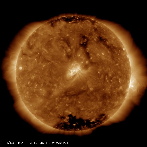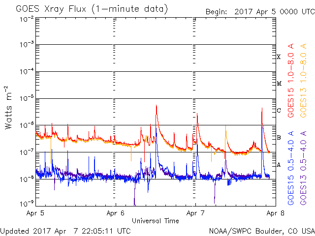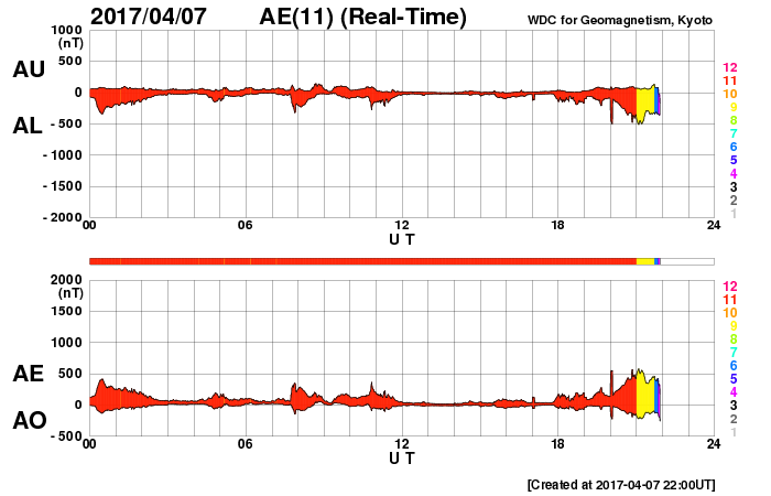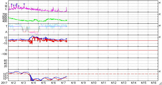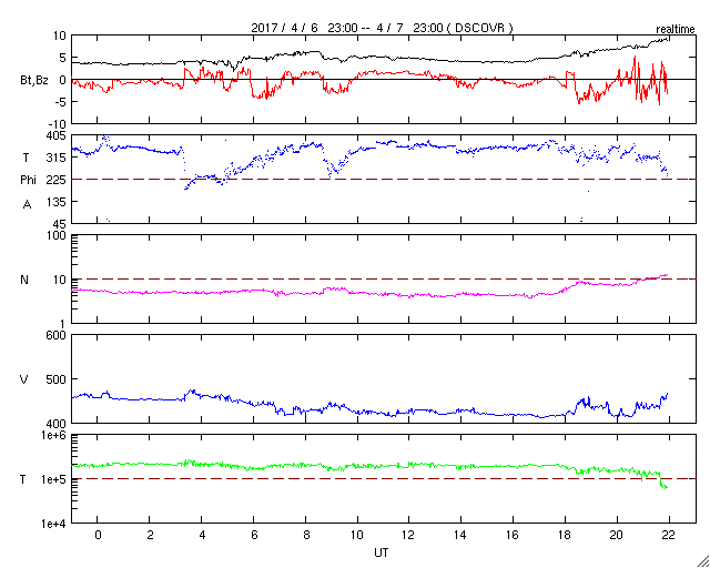 2017/ 4/ 8 07:05 更新 太陽風は平均的な状態です。太陽が無黒点になっています。 担当 篠原 太陽風は、速度が450km/秒から430km/秒へやや下がり、 平均的な状態です。 磁場強度も、4〜5nTと平均的な状態で安定していましたが、 今朝早くからやや強まる変化が見られ、現在8nTに少し高まっています。 一時的な変化なのか、続いて速度も高まるのか、 引き続き注目してください。 目立つほどのコロナホールはないので、弱い変化に留まりそうです。 磁気圏は、基本的には穏やかですが、 太陽風磁場が南向きに振れる変化の影響で、 AE指数300〜500nTの小規模の活動が時々発生しています。 現在は、太陽風の磁場がやや強まっているため、 南向きの変化も大きくなりやすくなっています。 このため、AE指数のグラフも後半の変化がより大きくなっています。 太陽では、2645黒点群が西の端にほぼ沈んでいます。 この2645群で、8日4時半(世界時7日19時半)に、 C4.3の小規模フレアが発生しています。 地球から見える、2645群の最後のフレアになりそうです。 また、中央部の2648黒点群も見えなくなり、 太陽は無黒点になっているようです。 太陽が無黒点になるのは、3月21日以来です。