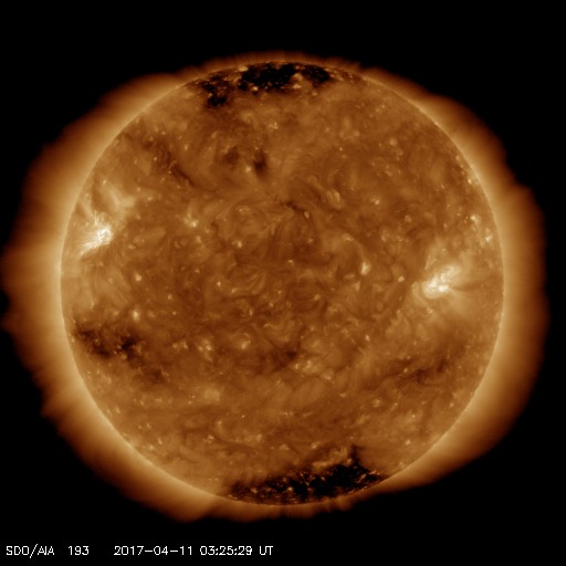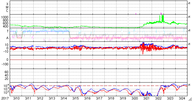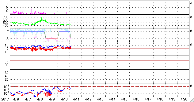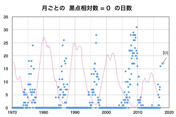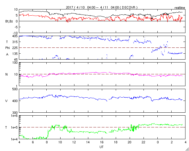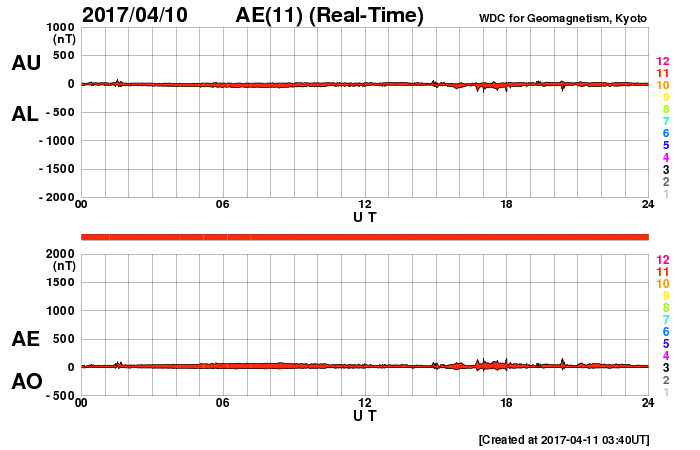 2017/ 4/11 12:42 更新 太陽風は平均的な状態です。3月の黒点相対数は 17.7 でした。 担当 篠原 WDC-SILSOから発表された太陽の黒点相対数をお知らせします。 2月は 26.1 、3月は 17.7 でした(2月の報告をしていませんでした)。 12月に18.5と初めて10台に下がっていたのですが、 それを超えて、今極小期の最小値になっています。 詳しく見ると、3月の中旬までとそれ以降で太陽の様子は大きく変わっています。 中旬までは、3月6日から20日にかけて連続15日間無黒点の日が続くほど、 活動は低い状態になっていたのですが、 26日以降は、2644黒点群、2645黒点群の出現で50台に高まりました。 この値は、1枚目のグラフを見ると1年前くらいの水準です。 この最後の高まりがなければ、 月平均値は一気に一桁台まで下がっていたかもしれません。 また、3枚目の無黒点日数のグラフでは、 3月は1か月の半分を超える数値に高まっています。 まだまだ増えていきそうな様子です。 4月も、最初の数日は高い値になっていると思われますが、 現在は再び黒点の少ない状態に戻っています。 次の発表の時にどうなっているか注目してください。 現在の太陽風は、420km/秒前後と平均的な速度で安定しています。 磁場強度は、8nTから5nTへ一旦下がりましたが、 今朝から再び7nTに少し上がっています。 全体としては穏やかに推移しています。 太陽風磁場の南北成分は、北向きの傾向になっています。 このため、磁気圏の活動度は低く、 AE指数のグラフはほとんど変化が見られません。 この後、太陽風が低速風に変わっていくと、 磁気圏も穏やかな状態が続きそうです。 太陽は、2650黒点群がぽつんと見えるだけで、 こちら側は穏やかな状態です。 しかし、裏側では黒点群の活動が続いているようで、 STEREO Aheadの観測では、フレアと思われる変化や、 CMEの噴出も発生しています。