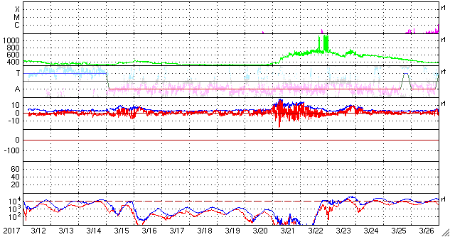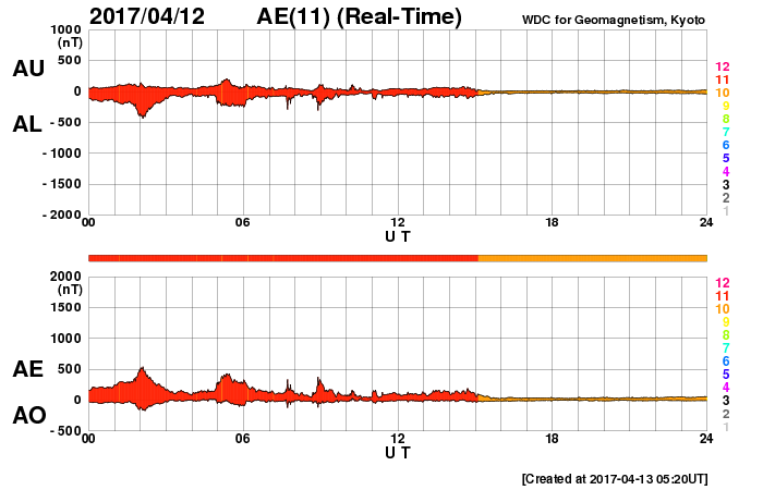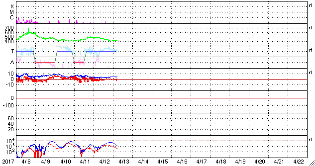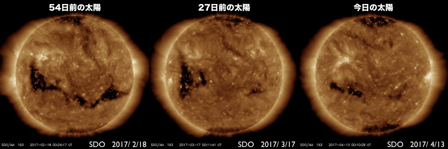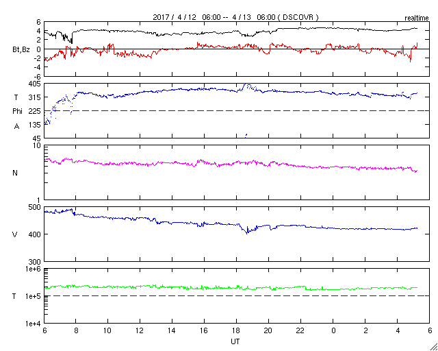 2017/ 4/13 14:23 更新 太陽風は平均的な速度に戻り、磁気圏も静穏です。 担当 篠原 太陽風の速度は、 昨日の夕方まで480km/秒と高まった状態が続きましたが、 その後低下して、 現在は420km/秒と平均的な速度に戻っています。 速度の高まりは、1日程度で終わっています。 太陽風の磁場強度は、4nTと平均的な値で安定しています。 南北成分は、0nT付近で小さく変化しています。 磁気圏は穏やかで、 AE指数はほとんど変化しない状態が半日ほど続いています。 SDO衛星AIA193では、 太陽の中央部のやや左下に小さいコロナホールが見えています。 このコロナホールは、以前の周期ではより大きく広がっていたのですが、 今回はだいぶ縮小しています。 以前の周期との比較の図を、1枚目に掲載します。 27日周期の図を見ると、 前周期は3月21日から高速の太陽風が始まっていますが、 今回は、高速風の影響は小さくなっている可能性があります。 太陽は、2650黒点群が小さく見えているだけです。 X線グラフの変化も少なくなり、とても穏やかです。