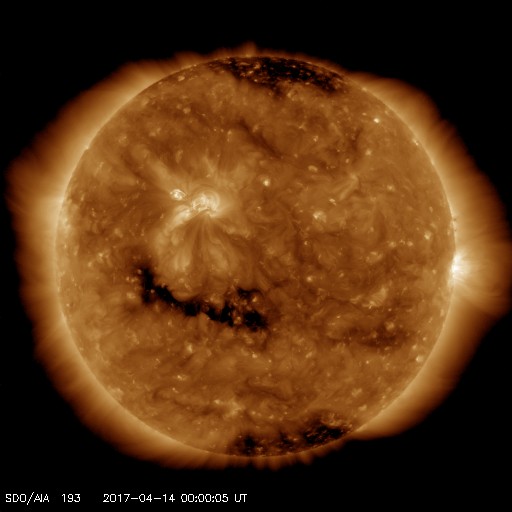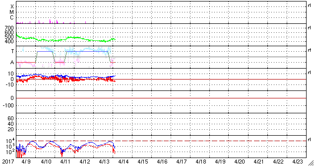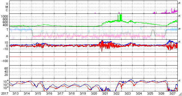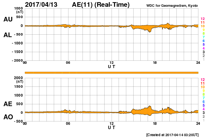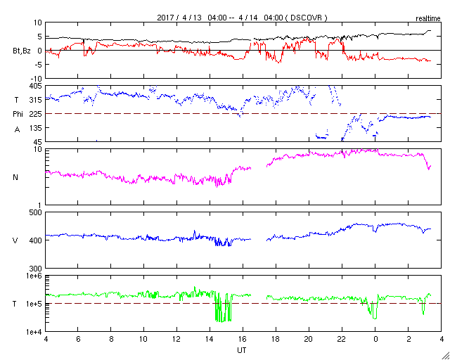 2017/ 4/14 12:38 更新 太陽風は平均的な状態です。磁場が南寄りになって、磁気圏の活動がやや高まっています。 担当 篠原 太陽風の速度は、 400km/秒から440〜450km/秒へ少し上がっています。 変化としては小さく、太陽風は穏やかです。 磁場強度は、5nT前後で安定しています。 太陽風磁場の南北成分は、 グラフの後半にかけて南寄りの傾向になっています。 このため、磁気圏の活動もやや高まっていて、 AE指数のグラフは、前半はほとんど変化がありませんが、 後半になると、300〜500nTの小規模の変化が続いています。 SDO衛星AIA193の太陽写真では、 太陽の中央部の細長いコロナホールは、 先頭(右端)が太陽の中心線に達した頃です。 影響がやって来るのは3日後くらいと考えられますが、 コロナホールの分布が前周期から変化しているので、 27日周期の図を見ながら、今後の推移に注目して下さい。 太陽は、2650黒点群が小さく見えている程度です。 X線グラフの変化もなく、とても穏やかです。 ![]() 世界時4月13日のAE指数(速報値)。 (c) 京都大学WDC ![]() 世界時4月14日のAE指数(速報値)。 (c) 京都大学WDC ![]() SDO衛星のAIA193カメラによる太陽コロナの様子 (c) SDO (NASA) ![]() SDO衛星による太陽の可視光写真。マウスの矢印を写真に重ねると、黒点番号付きの写真に切り替わります。 (c) SDO (NASA) ![]() DSCOVRが観測した太陽風の磁場(1番上の枠、黒線は全体の強度、赤線は南北成分) および、太陽風の密度(3番目の紫線)、速度(4番目の青線) (c) データ:NOAA/SWPC、作図:宇宙天気ニュース ![]() 27日の太陽周期に合わせたデータプロット 太陽が同じ面を地球に向けていた27日前の変化から、今後を予想することができます。 (c) 作図:宇宙天気ニュース
