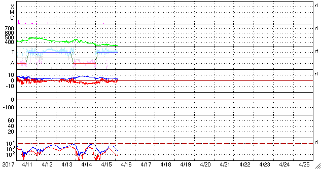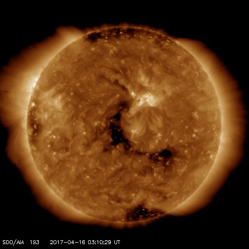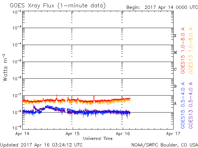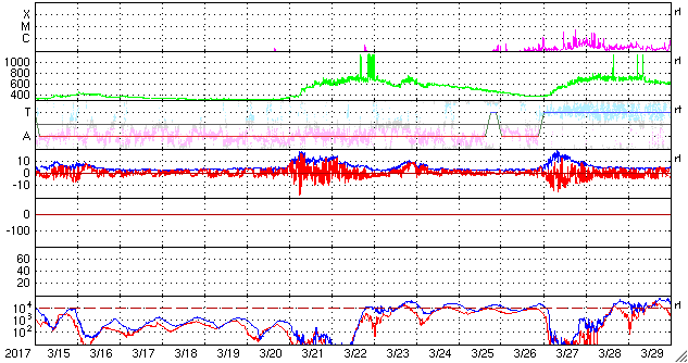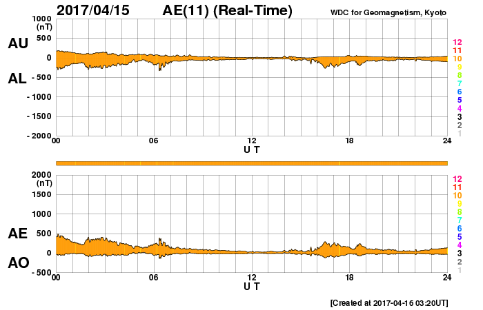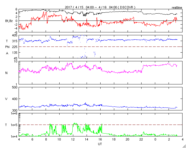 2017/ 4/16 12:24 更新 太陽風は320km/秒の低速風です。太陽は無黒点です。 担当 篠原 太陽風は、320km/秒と更に遅い風になっています。 また、磁場強度も5nTから3nTへ少し下がっています。 27日周期の図の前周期と同じ様な穏やかな状態になっています。 一方、SDO衛星AIA193では、コロナホールが更に西に進み、 地球へ影響が及び始める目安の位置に近づいています。 前周期は、700km/秒に達する高速太陽風が到来しましたが、 コロナホールが小さくなった今回は、 どの程度の高まりになるでしょうか。 太陽風磁場の南北成分は、南寄りの強まりが終わり、 南北両方に変化するようになっています。 しかし、変化の幅は小さく、速度も下がっているため、 磁気圏への影響は限定的で、 AE指数は、250nT程度の小規模の活動が 時間をおいて発生している程度です。 太陽は、無黒点になっているようです。 X線グラフもほとんど変化がなく、 太陽はとても穏やかです。