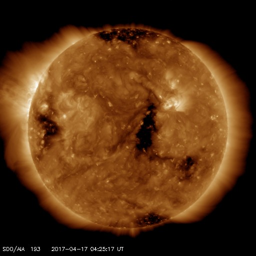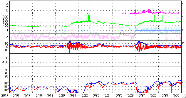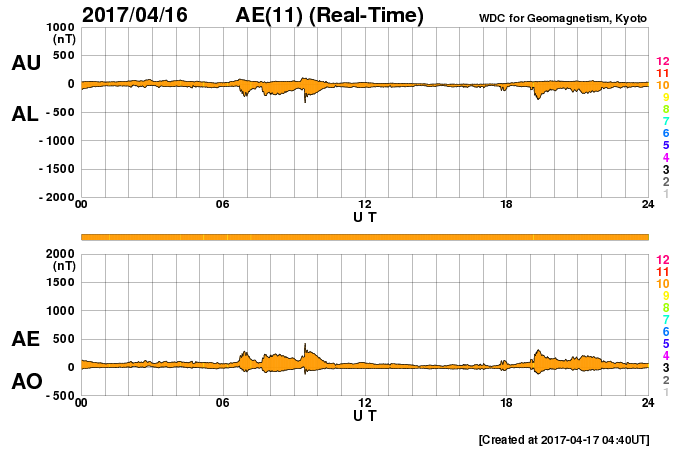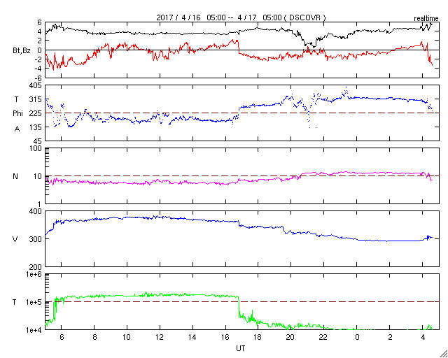 2017/ 4/17 13:41 更新 太陽風は低速です。C2.0の小規模フレアが発生しました。ニュージーランドのオーロラをどうぞ。 担当 篠原 中村太一さんによるニュージーランドのオーロラの写真を紹介します。 4月10日に掲載した写真の翌日、現地3月28日と29日の夜の撮影です。 600〜700km/秒の高速太陽風が続く中の現象です。 中村さんによると、前夜(前回掲載の写真)の活発なオーロラがニュースになり、 現地では非常に多くの人がオーロラを見に外出していたそうです。 1枚目の28日は雲が多く、切れ間から見えた強い縦筋のオーロラを撮影。 2枚目は、晴れ間に恵まれて、街明かりに負けない高めのオーロラが現れたそうです。 しかし、前の夜に比べると活動が弱く、 オーロラの彩度や強さに差が現れているとのことです。 写真を送っていただいたのは、2週間前だったのですが、 紹介するのが遅れてしまい申し訳ありません。 ニュージーランドでも、ニュースに触発されて多くの人が見に行くのですね。 現地の興味深い情報もありがとうございます。 太陽風は、昨日のニュースの後に、 370km/秒くらいまで速度が上がりましたが、 今日に入るとまた低下して、現在は300km/秒まで下がっています。 かなり遅い風になっています。 変化そのものは小規模で、27日周期の図では、 グラフがわずかに高まった程度です。 磁場強度は、4〜5nTと平均的な状態が続き、 太陽風は、全体としては穏やかな風が続いています。 太陽風磁場の南北成分は、南に振れたり北に振れたりしていますが、 変化は小さく、速度も下がっているため磁気圏は概ね静穏で、 AE指数は200nTの小規模の変化が時々発生している程度です。 SDO衛星AIA193では、 太陽の中心部のコロナホールは全体的に西半球に進み、 地球への影響が始まっても良い頃です。 27日周期の図の前周期も、 ちょうど今日に相当する、3月21日から速度の変化が始まっています。 今後の太陽風の変化に注目して下さい。 太陽は無黒点ですが、 東端の向こう側に活動的な領域がある様で、 17日11時半(世界時17日2時半)に、C2.0の小規模フレアが発生しています。 SDO衛星AIA131による動画を掲載します。 太陽の向こう側で発生しているので、 実際の規模はこれよりも大きかった可能性があります。 今後、どのような領域が姿を現すでしょうか。