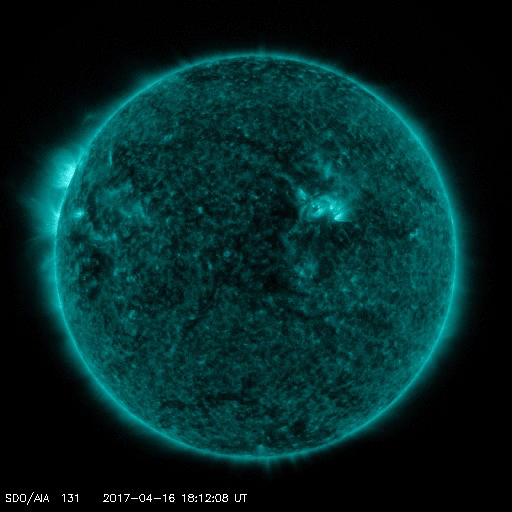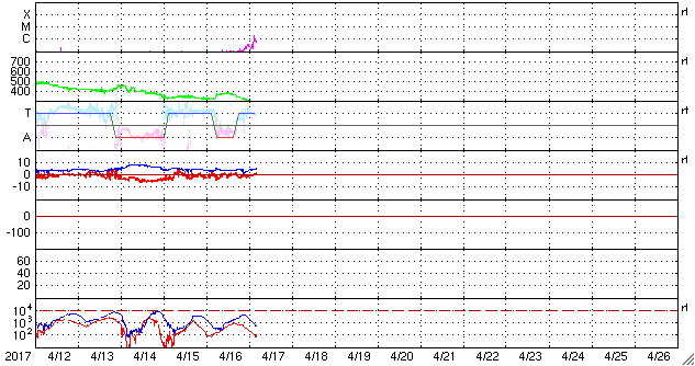 (c) 中村太一氏 ![]() ニュージーランド南島ダニーデンで、現地3月29日22時18分(世界時29日9時18分)に撮影されたオーロラ。 (c) 中村太一氏 ![]() 太陽の東端で発生したC2.0の小規模フレア。SDO衛星AIA131。 (c) SDO (NASA)、(動画加工 : 宇宙天気ニュース) ![]() 世界時4月16日のAE指数(速報値)。 (c) 京都大学WDC ![]() 世界時4月17日のAE指数(速報値)。 (c) 京都大学WDC ![]() SDO衛星のAIA193カメラによる太陽コロナの様子 (c) SDO (NASA) ![]() SDO衛星による太陽の可視光写真 (c) SDO (NASA) ![]() DSCOVRが観測した太陽風の磁場(1番上の枠、黒線は全体の強度、赤線は南北成分) および、太陽風の密度(3番目の紫線)、速度(4番目の青線) (c) データ:NOAA/SWPC、作図:宇宙天気ニュース ![]() 27日の太陽周期に合わせたデータプロット 太陽が同じ面を地球に向けていた27日前の変化から、今後を予想することができます。 (c) 作図:宇宙天気ニュース
