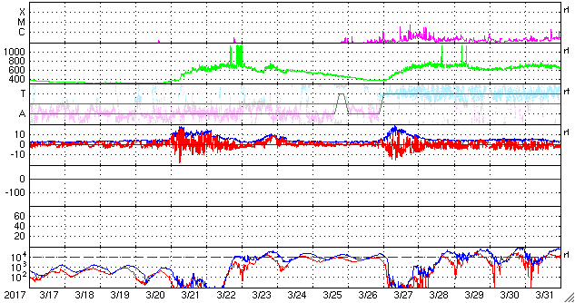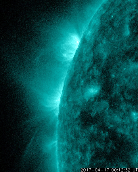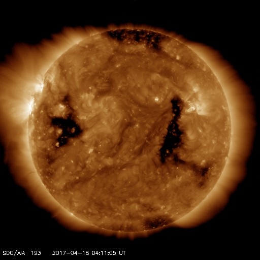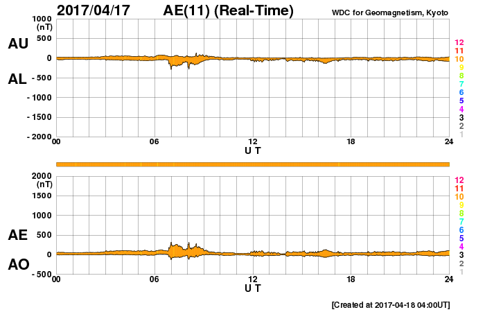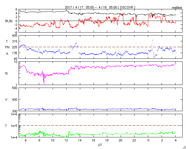 2017/ 4/18 13:16 更新 太陽の東端に黒点が現れています。太陽風は低速です。 担当 篠原 太陽の東端から、新しい黒点が現れています。 昨日、C2.0のフレアを起こした領域です。 この領域の活動の様子を、SDO衛星AIA131の動画で紹介します。 C2.0以降は、Bクラスの小さいフレアばかりですが、 活発に活動が続いています。 今後、活動の規模が大きくなる様だと、注意が必要になるでしょう。 太陽風は、310km/秒と低速の状態で安定しています。 磁場強度も、3nTとやや弱くなっています。 27日周期の図では、前周期は既に高速風が始まっていますが、 コロナホールの分布が変化していたため、 太陽風の様子も変わっているようです。 今日のSDO衛星AIA193の写真では、 コロナホールの最も広がっていた領域も、西側にだいぶ進んでいます。 太陽風の変化は到来すると思われますが、 どのタイミングになるか注目してください。 太陽風磁場の南北成分は、グラフの前半は南寄りですが、 後半はやや北寄りになっているようです。 速度が下がっていることもあり、磁気圏の活動は低調で、 AE指数は小さい変化しか見られません。