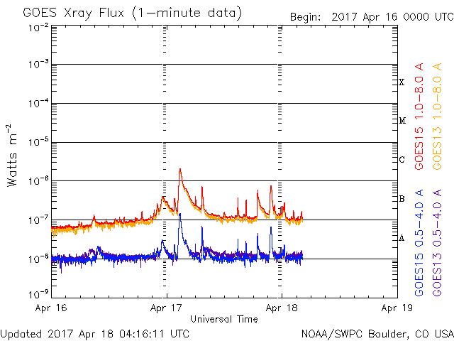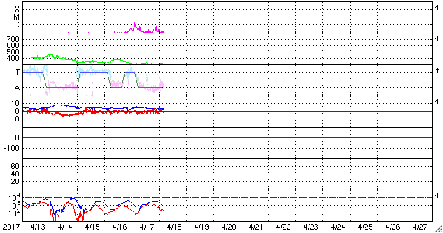 (c) SDO (NASA)、(動画加工 : 宇宙天気ニュース) ![]() 世界時4月17日のAE指数(速報値)。 (c) 京都大学WDC ![]() 世界時4月18日のAE指数(速報値)。 (c) 京都大学WDC ![]() SDO衛星のAIA193カメラによる太陽コロナの様子 (c) SDO (NASA) ![]() SDO衛星による太陽の可視光写真。マウスの矢印を写真に重ねると、黒点番号付きの写真に切り替わります。 (c) SDO (NASA) ![]() GOES衛星の太陽X線データ (c) NOAA/SWPC ![]() DSCOVRが観測した太陽風の磁場(1番上の枠、黒線は全体の強度、赤線は南北成分) および、太陽風の密度(3番目の紫線)、速度(4番目の青線) (c) データ:NOAA/SWPC、作図:宇宙天気ニュース ![]() 27日の太陽周期に合わせたデータプロット 太陽が同じ面を地球に向けていた27日前の変化から、今後を予想することができます。 (c) 作図:宇宙天気ニュース