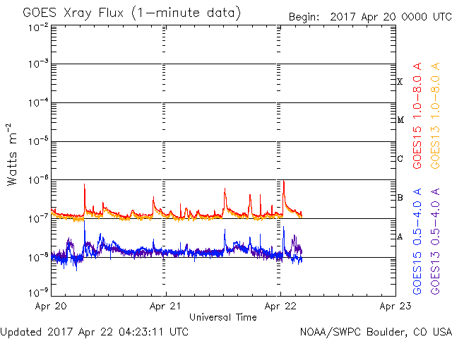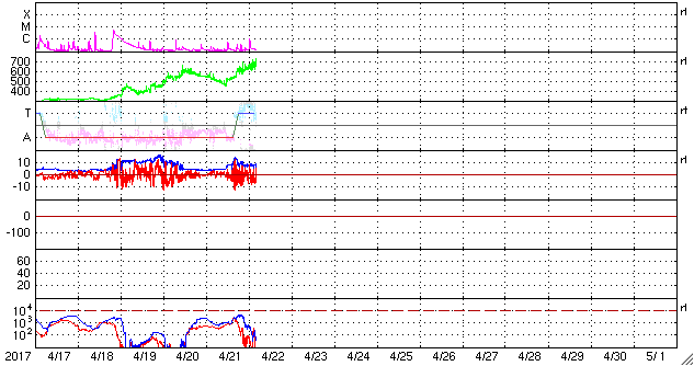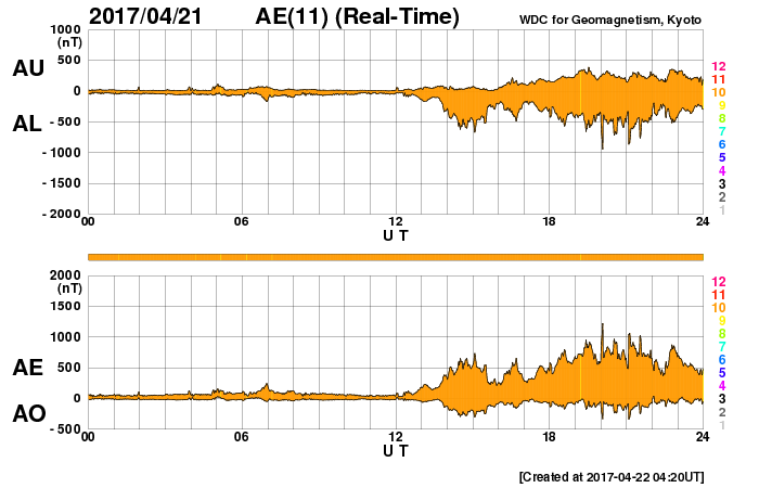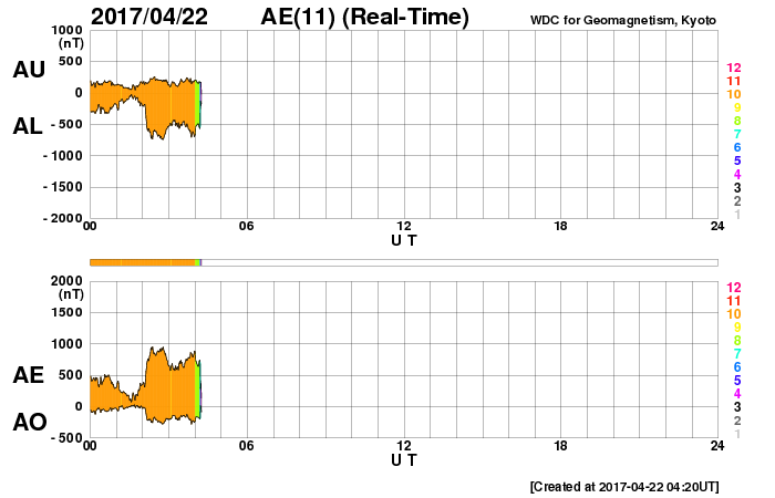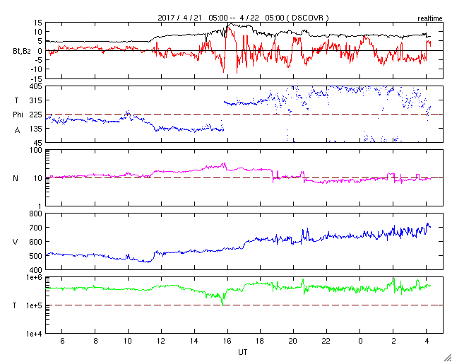 (c) SOHO (ESA & NASA)、 (動画加工 : 宇宙天気ニュース) ![]() 世界時4月21日のAE指数(速報値)。 (c) 京都大学WDC ![]() 世界時4月22日のAE指数(速報値)。 (c) 京都大学WDC ![]() SDO衛星のAIA193カメラによる太陽コロナの様子 (c) SDO (NASA) ![]() SDO衛星による太陽の可視光写真。マウスの矢印を写真に重ねると、黒点番号付きの写真に切り替わります。 (c) SDO (NASA) ![]() GOES衛星の太陽X線データ (c) NOAA/SWPC ![]() DSCOVRが観測した太陽風の磁場(1番上の枠、黒線は全体の強度、赤線は南北成分) および、太陽風の密度(3番目の紫線)、速度(4番目の青線) (c) データ:NOAA/SWPC、作図:宇宙天気ニュース ![]() 27日の太陽周期に合わせたデータプロット 太陽が同じ面を地球に向けていた27日前の変化から、今後を予想することができます。 (c) 作図:宇宙天気ニュース