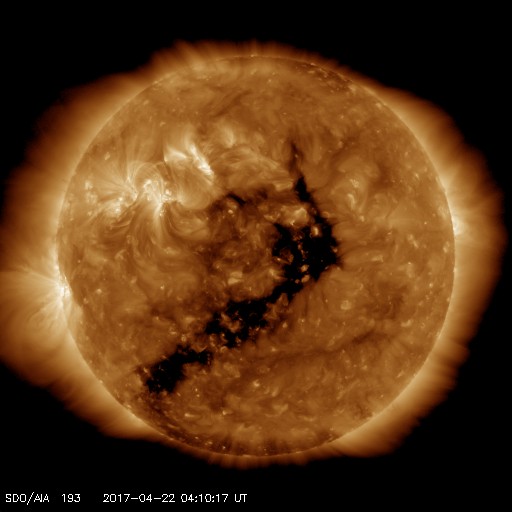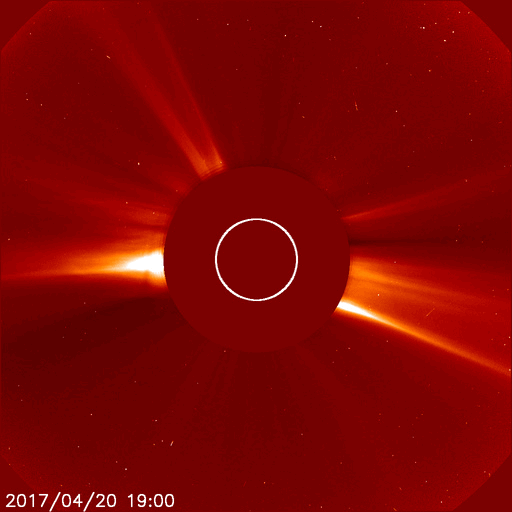2017/ 4/22 13:23 更新 太陽風は700km/秒に速度が高まっています。磁気圏の活動も活発です。 担当 篠原 昨日発生したフィラメント噴出によるCMEの様子を、 SOHO衛星LASCO C2、C3の動画で紹介します。 噴出しているガスは比較的淡く、主に上に向かって飛び出しています。 発生地点から考えると、地球へ影響がやって来る可能性がありますが、 その場合も変化は小さいものになりそうです。 太陽は、東端から2653黒点群が現れています。 フレアは、2651群でBクラスの小さい変化が数回起きている程度で、 今のところは比較的穏やかです。 太陽風は、昨夜から速度が再び高まり始め、 現在、700km/秒に達しつつあります。 磁場強度も昨夜から強まり、最大で15nT近くまで高まりました。 現在は少し下がっていますが、7〜8nTとやや強まった状態です。 27日周期の図の前周期を見ると、今日に相当する3月26日は、 2つの高速風にはさまれた低速風の期間でした。 今回、太陽風の様子が大きく変化しているようです。 SDO衛星AIA193を見ると、中心部のコロナホールは西側に進み、 この領域からの影響は、これから強まって行きます。 来週にかけて、太陽風は高まった状態が続きそうです。 太陽風磁場の南北成分は、 磁場が強まった頃から南北に大きく変化するようになり、 速度の高まりもあって、 AE指数は700〜1000nTの活発な変化が半日にわたって続いています。 太陽風の高まりがこのまま続くと、 磁気圏もしばらくにぎやかな状態が続きそうです。