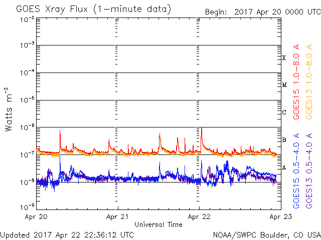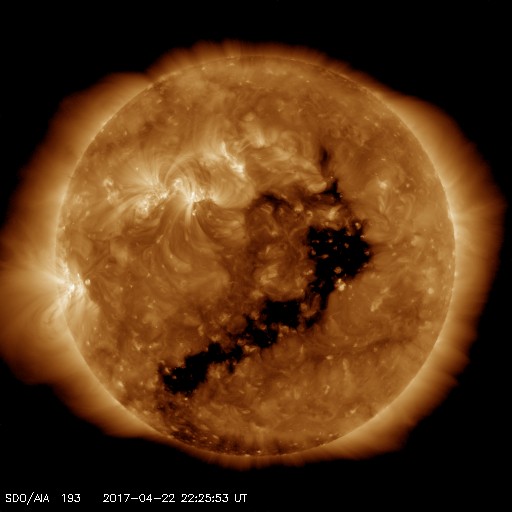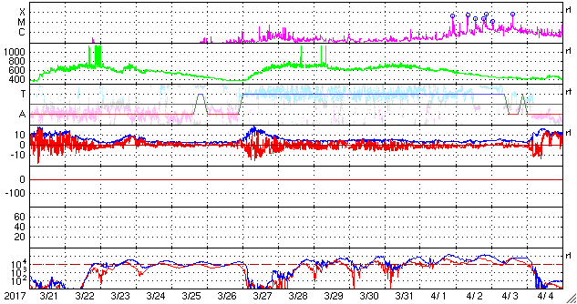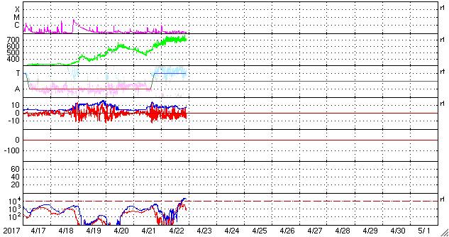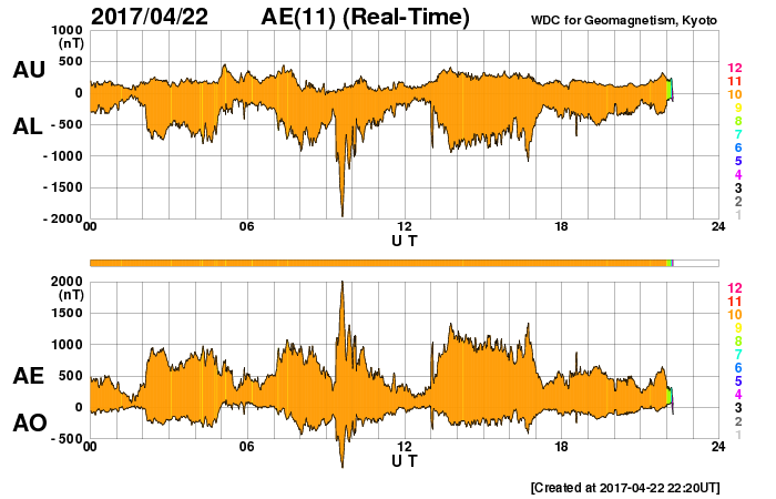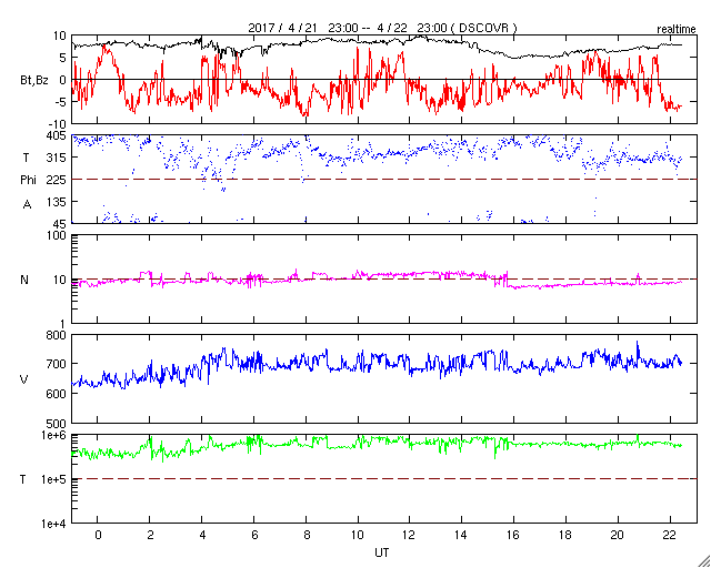 2017/ 4/23 07:37 更新 700km/秒の高速太陽風が続き、磁気圏の活動は更に強まっています。 担当 篠原 昨日の昼に700km/秒とかなり高い速度まで高まった太陽風は、 現在もこの速度を保っています。 磁場強度も、5〜10nTとやや強まった状態で変化しています。 4月20日に始まった今回の高速太陽風は、4日目に入っています。 SDO衛星AIA193の太陽写真のコロナホールは、 赤道付近の先頭が、太陽の西半球の半分くらいに進み、 影響が及び始める目安の位置に達しています。 続いて、南半球に伸びるコロナホールの影響がやって来ると考えると、 27日周期の図の前周期のように、 高速太陽風は更に1週間近く続くかもしれません。 太陽風磁場の南北成分は、やや南寄りに振れています。 磁場強度が高まっているため、 -5〜-10nT程度の強い南向きの変化が繰り返し発生しています。 このため、磁気圏の活動はかなり高まっていて、 AE指数のグラフは、1000nT前後の激しい活動が連続的に発生しています。 22日18時半(世界時22日9時半)には、 2000nTに達する大きな変化も記録されています。 太陽は、昨日朝のB9.6の小さいフレア以降、特に活動は見られず、 静かな状態が続いています。 放射線帯の高エネルギー電子が、 高速太陽風の影響を受けて、10,000に達しています。 今後、更に増加する可能性があります。