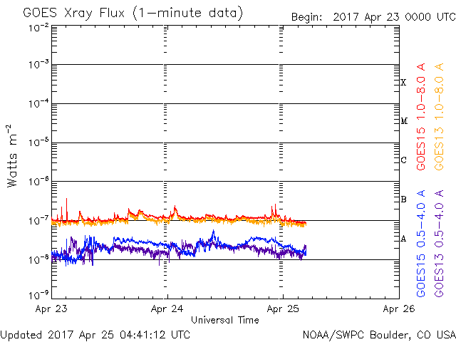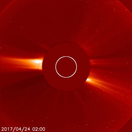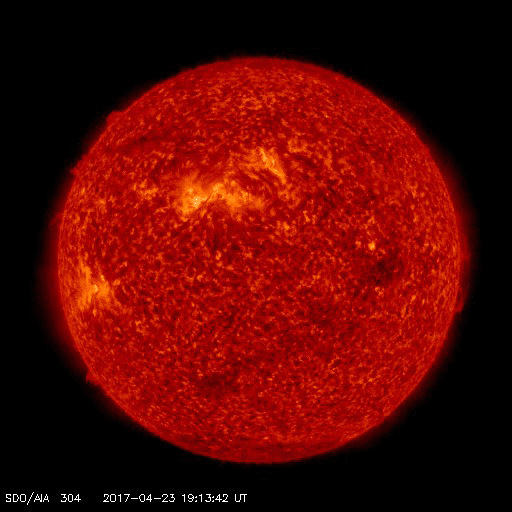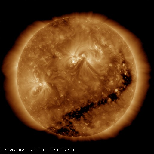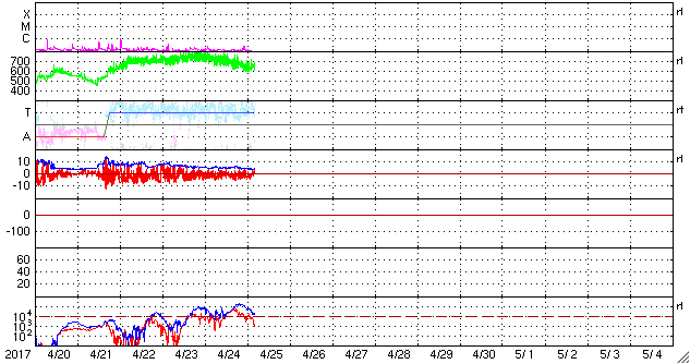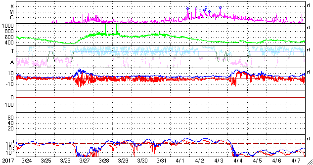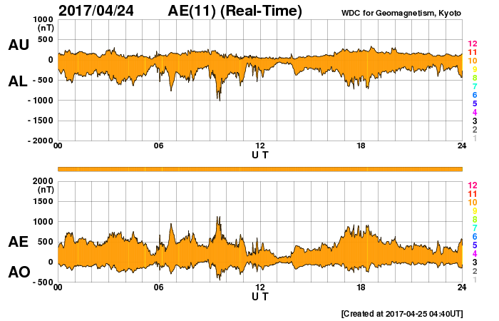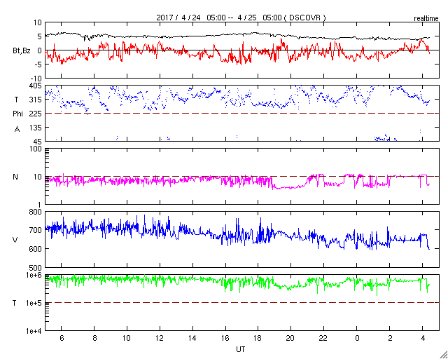 2017/ 4/25 13:40 更新 高速の太陽風が続き、磁気圏も活動的です。 担当 篠原 太陽風は、高速の風が続いていますが、 速度は730km/秒から650km/秒へゆっくりと下がっています。 磁場強度も5nTから4nTへ少し弱まり、 高速太陽風の領域は、ピークを越えたのかもしれません。 磁場の南北成分は、やや南寄りの様子ですが、 振れ幅は-3nT程度と小さくなっています。 磁気圏活動の高まりは続いていますが、 変化はやや弱くなっているようで、 AE指数は、グラフの前半は800nTくらいの変化も起きていますが、 次第に500nT程度に下がっています。 27日周期の図を見ると、前周期は更に5日近く高速太陽風が続いています。 今回はどこまで続くでしょうか。 太陽では、昨日昼、24日10時(世界時24日1時)頃に、 北東部(左上)でフィラメント噴出が発生しています。 SDO衛星AIA304による動画を掲載します。 また、淡いCME(太陽ガスの放出現象)も飛び出しています。 磁場の強まりが地球へもやって来る可能性がありますが、 変化は小規模になりそうです。 目立ったフレアの発生はありません。 放射線帯の高エネルギー電子は、更に高まって、 GOES15(青線)は、10万を超えています。 ![]() 太陽の北東部(左上)で発生したフィラメント噴出。SDO衛星AIA304。 (c) SDO (NASA)、(動画加工 : 宇宙天気ニュース) ![]() (c) SOHO (ESA & NASA)、 (動画加工 : 宇宙天気ニュース) ![]() 世界時4月24日のAE指数(速報値)。 (c) 京都大学WDC ![]() 世界時4月25日のAE指数(速報値)。 (c) 京都大学WDC ![]() SDO衛星のAIA193カメラによる太陽コロナの様子 (c) SDO (NASA) ![]() SDO衛星による太陽の可視光写真。マウスの矢印を写真に重ねると、黒点番号付きの写真に切り替わります。 (c) SDO (NASA) ![]() DSCOVRが観測した太陽風の磁場(1番上の枠、黒線は全体の強度、赤線は南北成分) および、太陽風の密度(3番目の紫線)、速度(4番目の青線) (c) データ:NOAA/SWPC、作図:宇宙天気ニュース ![]() 27日の太陽周期に合わせたデータプロット 太陽が同じ面を地球に向けていた27日前の変化から、今後を予想することができます。 (c) 作図:宇宙天気ニュース