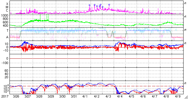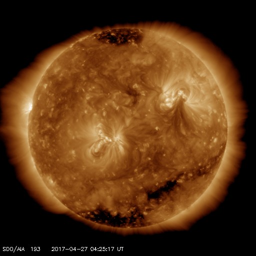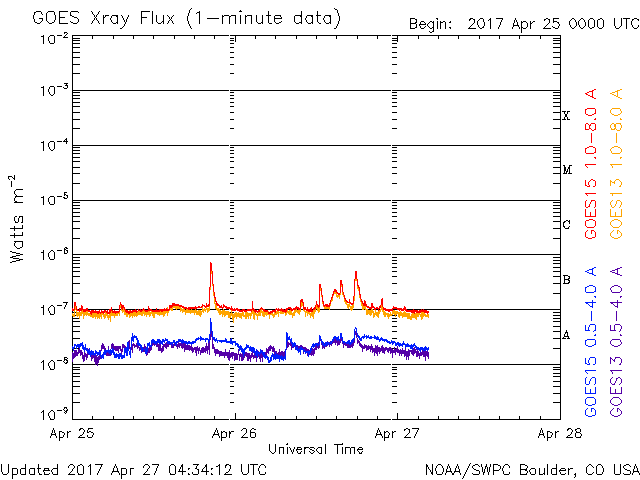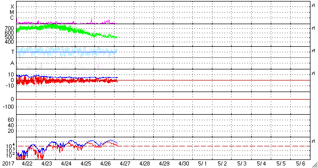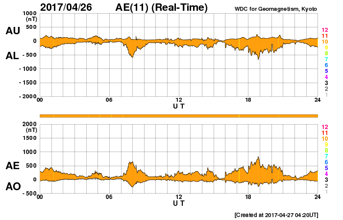 2017/ 4/27 13:31 更新 太陽風は500km/秒と高速の状態が続いています。 担当 篠原 太陽風は高速の風が続いています。 速度は、昨夜から再び500km/秒に下がり、 現在もこの状態が続いています。 太陽風の磁場強度は、5nTと平均的な値で安定しています。 南北成分は、南寄りの傾向が続いていますが、 振れ幅が小さくなってきたため、磁気圏の活動も小さくなりつつあり、 AE指数のグラフは、時々、500nT程度の中規模の活動が起きている状況です。 SDO衛星AIA193では、コロナホールは更に西に進み、 太陽風への影響はこの後弱まっていきそうです。 太陽は、Bクラスの小さい活動が起きていますが、 全体としては穏やかです。 東端から活動的な領域が上がってきたようですが、 小さい黒点が見えるかどうかという程度です。 放射線帯の高エネルギー電子は、 今日も10万を超えて高まった状態が続いています。 今後は、ゆっくりと減少に向かいそうです。