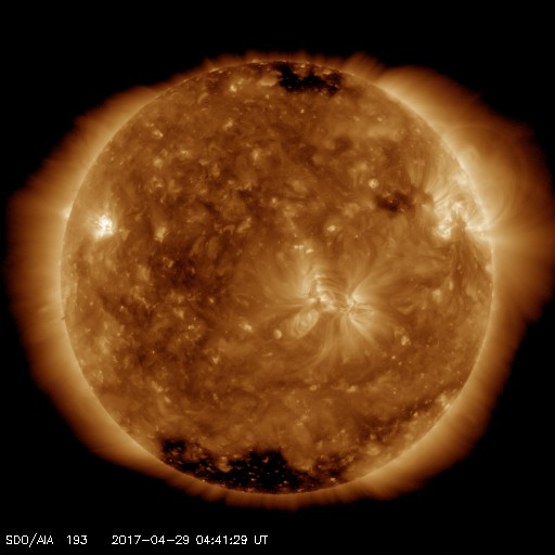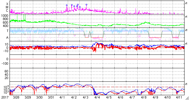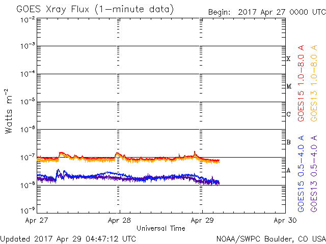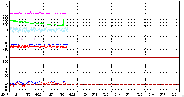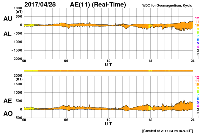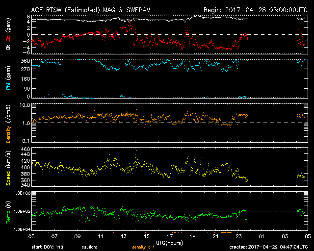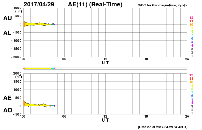 2017/ 4/29 13:48 更新 太陽風は平均的な状態です。ニュージーランドのオーロラをどうぞ。 担当 篠原 ニュージーランドの米戸 実さんより、 22日の夜に撮影されたオーロラの写真をいただきました。 一昨日に終わった高速太陽風の始まりの頃の活動です。 今回の高速太陽風は20日に始まりましたが、 22日には700km/秒まで高まっていました。 磁場強度も8nTとやや強まった状態で、 -5nTを超える南向きの変化が頻繁に到来していました。 米戸さんの撮影は、世界時22日9時前後で、 AE指数を見ると、2000nTに達する激しい変化が発生しています。 米戸さんによると、世界時8時頃はたいしたことはなかったそうですが、 やがて、急に空が明るくなり、 何本もの火柱が上がり始めたそうです(1枚目の写真)。 この時は、活動が10分ほど続いて一旦終息。 続いて、世界時9時15分過ぎから第二波が始まり、 この日最大のオーロラになったそうです。 2枚目、3枚目、4枚目とオーロラの火柱の推移を見ることができます。 やや緯度の低いニュージーランドらしい見事なオーロラの写真です。 数分でどんどん動いて行く火柱の変化は、 活動が最も激しくなった瞬間を見事に捉えたからこそですね。 美しい写真をどうもありがとうございます。 現在の太陽風は、400km/秒と平均的な速度で安定しています。 DSCOVR衛星のデータが乱れているので、 今日は久しぶりにACE衛星の図を掲載します。 太陽風の磁場強度も、5nTと平均的な状態です。 南北成分は南寄りに変化していて、 磁気圏の活動は小規模ですが、 AE指数300〜500nTの変化が発生しています。 SDO衛星AIA193の太陽写真には、コロナホールは特に見られません。 太陽風はしばらく穏やかな状態が続きそうです。 太陽は穏やかです。 東端の黒点には2654群と番号が付きましたが、 掲載の写真ではかろうじて見える程度です。 放射線帯の高エネルギー電子は、数万に高まった状態が続いていますが、 減少の兆しも見えています。 ![]() ニュージーランド南島クィーンズタウンで、現地22日20時45分(世界時22日8時45分)に撮影されたオーロラ。 (c) 米戸 実氏 ![]() ニュージーランド南島クィーンズタウンで、現地22日21時24分(世界時22日9時24分)に撮影されたオーロラ。 (c) 米戸 実氏 ![]() ニュージーランド南島クィーンズタウンで、現地22日21時26分(世界時22日9時26分)に撮影されたオーロラ。 (c) 米戸 実氏 ![]() ニュージーランド南島クィーンズタウンで、現地22日21時31分(世界時22日9時31分)に撮影されたオーロラ。 (c) 米戸 実氏 ![]() 世界時4月28日のAE指数(速報値)。 (c) 京都大学WDC ![]() 世界時4月29日のAE指数(速報値)。 (c) 京都大学WDC ![]() SDO衛星のAIA193カメラによる太陽コロナの様子 (c) SDO (NASA) ![]() SDO衛星による太陽の可視光写真。マウスの矢印を写真に重ねると、黒点番号付きの写真に切り替わります。 (c) SDO (NASA) ![]() ACEが観測した太陽風の磁場(1番上の枠、白線は全体の強度、赤線は南北成分) および、太陽風の密度(3番目の橙線)、速度(4番目の黄線) (c) NOAA/SWPC ![]() 27日の太陽周期に合わせたデータプロット 太陽が同じ面を地球に向けていた27日前の変化から、今後を予想することができます。 (c) 作図:宇宙天気ニュース