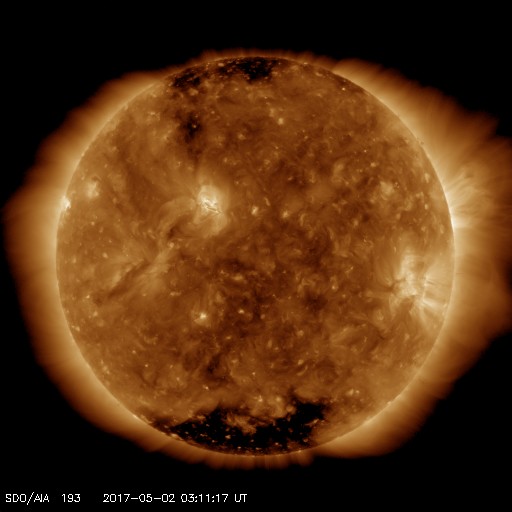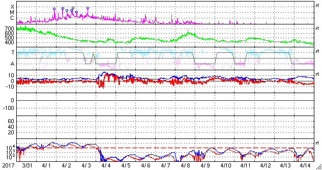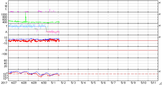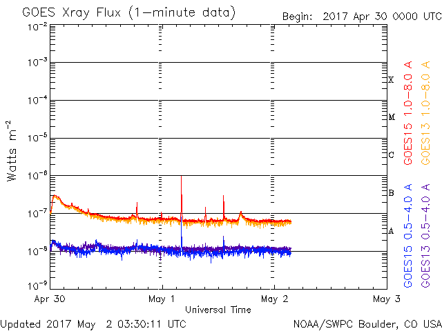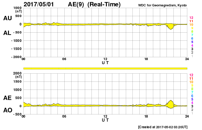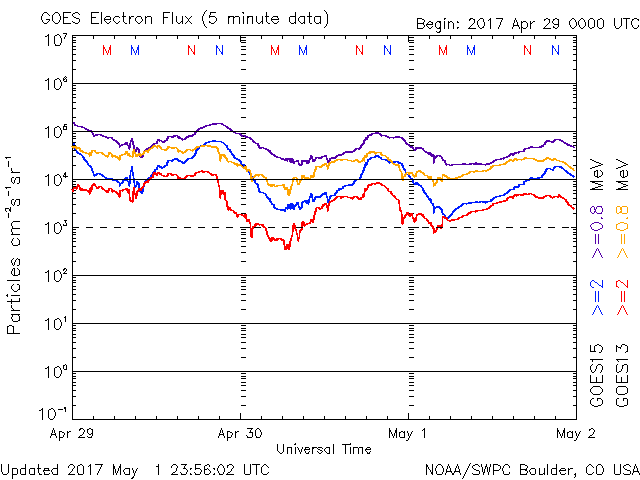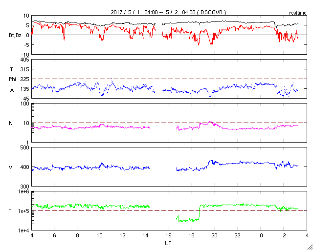 2017/ 5/ 2 12:30 更新 平均的な速度の太陽風が続いています。磁気圏は静穏です。 担当 篠原 昨日のニュース更新の時に発生したフレアは、 B9.9とぎりぎりでBクラスに留まる規模でした。 この領域は、その後は目立った活動はなく、 西の端に沈んで行きました。 太陽は、静かな状態が続いています。 太陽風は、速度が400km/秒に戻っています。 平均的な速さの風が続いています。 磁場強度は、7nTに少し上がっていますが、 一時的な変化ではないかと思います。 基本的には穏やかな太陽風が続くでしょう。 太陽風磁場の南北成分は、やや北寄りになっています。 このため、磁気圏はより静かになり、 AE指数は、小さい変化が1回起きている程度です。 放射線帯の高エネルギー電子は、 ゆっくりと減少しています。 青線のGOES15も、そろそろ10,000を割りそうです。