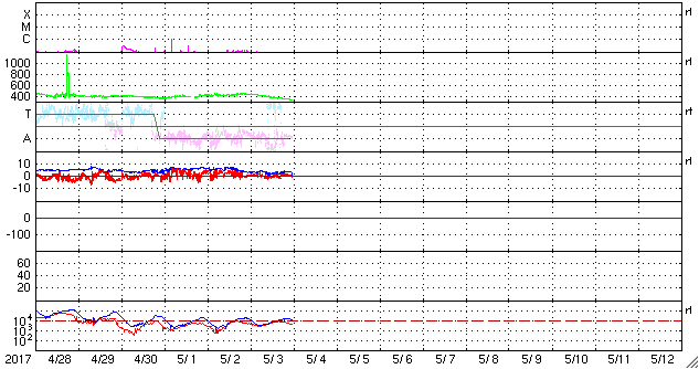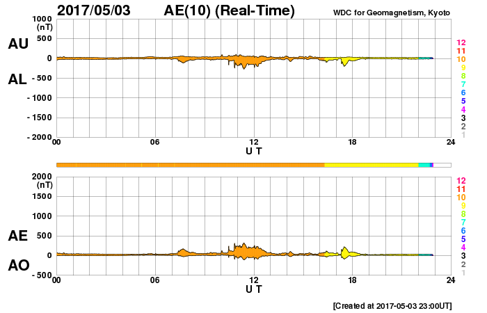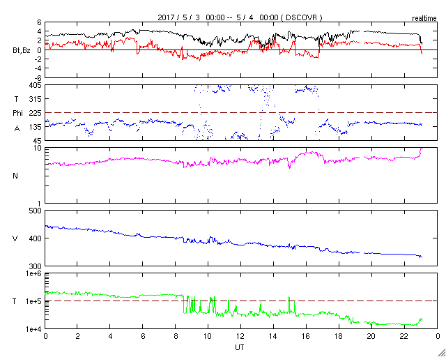 2017/ 5/ 4 08:13 更新 太陽風は340km/秒の低速風になっています。磁気圏も穏やかです。 担当 篠原 太陽風の速度は、400km/秒台を割って、 340km/秒と低速の風に変わっています。 27日周期の図を見ると、 前周期の今頃の太陽風は、速度が高まっていましたが、 今回は反対に低速に向かって変化しています。 太陽風の磁場強度も、3〜4nTとやや弱い状態です。 南北成分は0nT付近で小さく変化する程度で、 比較的北寄りの傾向が続いています。 このため、磁気圏は静穏の状態が続き、 AE指数は、太陽風の磁場が弱い南向きになった時間帯に 250nTの小さい変化が見られる程度で、 その他は変化がありません。 SDO衛星AIA193では、コロナホールは特に見られず、 穏やかな太陽風が続きそうです。 太陽は、2654黒点群が中央部に見えていますが、 目立った活動はなく、穏やかな状態が続いています。 放射線帯の高エネルギー電子は、 GOES15(青線)は今日も10,000に達しています。 太陽風と磁気圏が穏やかになっているため、 放射線帯の減少はゆっくり進んでいるようです。 ![]() 世界時5月3日のAE指数(速報値)。 (c) 京都大学WDC ![]() SDO衛星のAIA193カメラによる太陽コロナの様子 (c) SDO (NASA) ![]() SDO衛星による太陽の可視光写真。マウスの矢印を写真に重ねると、黒点番号付きの写真に切り替わります。 (c) SDO (NASA) ![]() DSCOVRが観測した太陽風の磁場(1番上の枠、黒線は全体の強度、赤線は南北成分) および、太陽風の密度(3番目の紫線)、速度(4番目の青線) (c) データ:NOAA/SWPC、作図:宇宙天気ニュース ![]() 27日の太陽周期に合わせたデータプロット 太陽が同じ面を地球に向けていた27日前の変化から、今後を予想することができます。 (c) 作図:宇宙天気ニュース