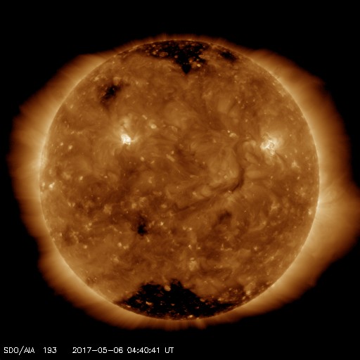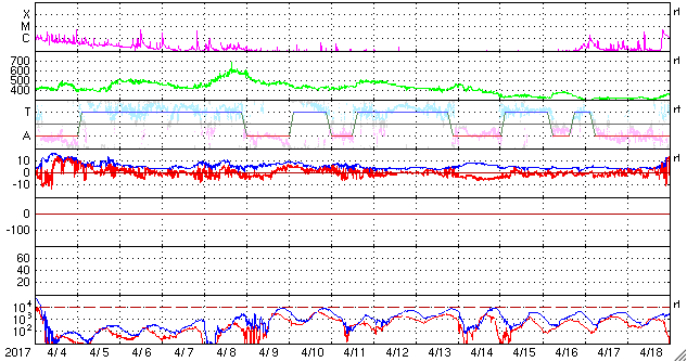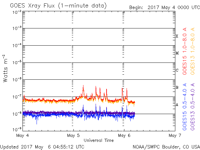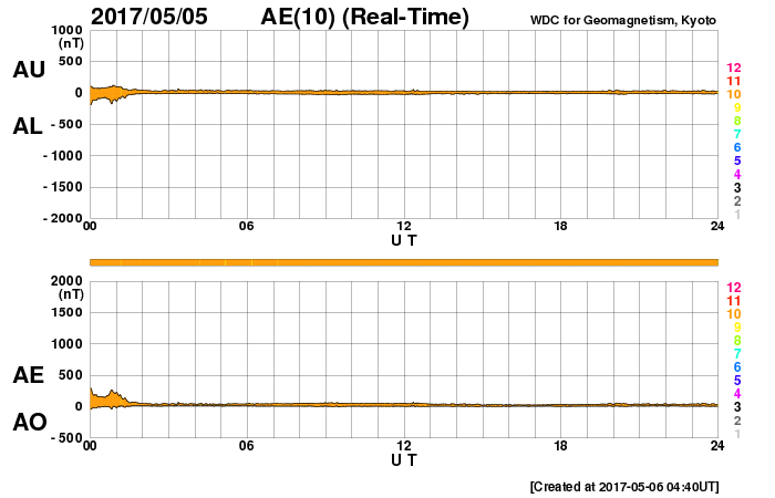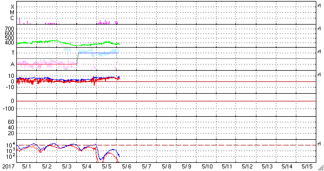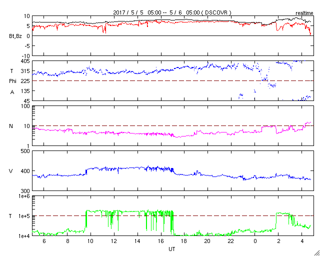 2017/ 5/ 6 13:56 更新 400km/秒に上がった太陽風の速度は、再び低速に戻っています。 担当 篠原 太陽風の速度は、昨日の夕方には400km/秒まで上がり、 平均的な速さに達しました。 しかし、深夜に入ると下がり始めて、 今朝には、360km/秒と低速の状態に戻っています。 一方、磁場強度は7〜9nTとやや強まった状態が続いています。 南北成分は、完全に北向きになっています。 このため、磁気圏はとても静穏で、 AE指数は全く変化のない状態が続いています。 27日周期の図を見ると、 前周期は500km/秒を超える高速風が到来していたのですが、 今回は、このまま穏やかに推移しそうです。 太陽では、新しく現れた2655黒点群の活動度がやや高まり、 Bクラスの小さいフレアが10回ほど発生しています。 黒点としては既に小さくなりかけていますが、 今後の変化に注目して下さい。 放射線帯の高エネルギー電子は、 10,000を割って大きく減少しています。