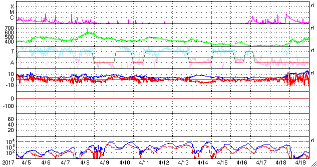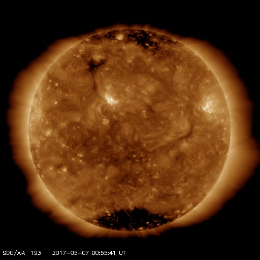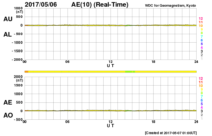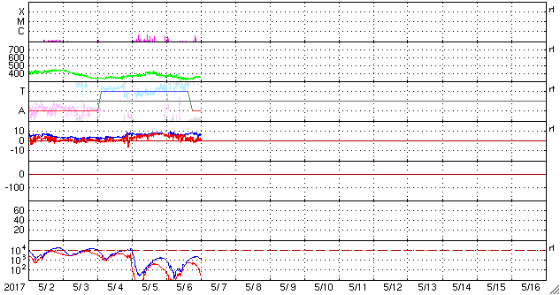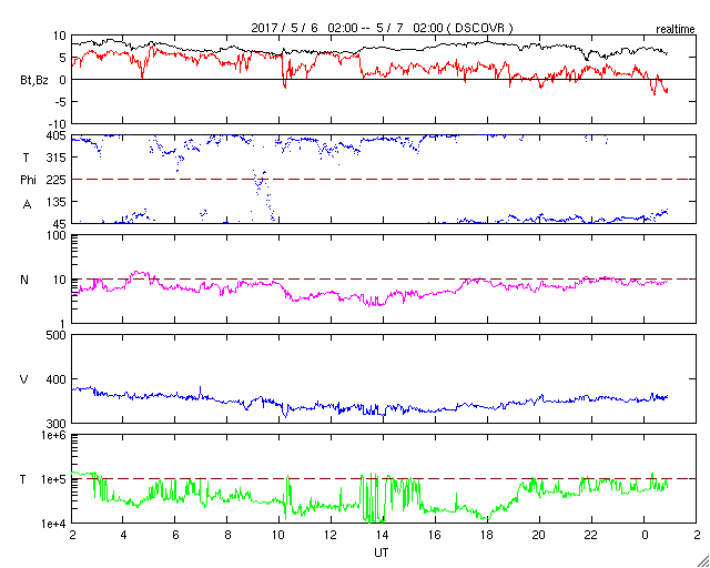 2017/ 5/ 7 10:03 更新 太陽風は低速で、磁気圏はとても穏やかです。 担当 篠原 太陽風は、330〜350km/秒と低速の風が続いています。 磁場強度は、7〜8nTとやや強まった状態です。 磁場の南北成分は、北寄りの傾向が続いています。 しかし、細かく見ると、次第に0nT近くに下がってきています。 今後、南向きにも変化するようになるのでしょうか。 太陽風の磁場が北寄りになっているため、 磁気圏は穏やかな状態が続いています。 AE指数のグラフは、ほとんど変化が発生していません。 27日周期の図を見ると、 前周期の4月6〜9日は太陽風の速度が高まっていましたが、 今回は穏やかな風のままでした。 前周期のグラフも、今後は速度は下がって、 穏やかな太陽風が続いています。 SDO衛星AIA193には、極域以外にコロナホールは特に見られず、 前周期と同様の穏やかな状態が続きそうです。 太陽は、Bクラスの小さい変化が起きている程度で、 穏やかな状態が続いています。 2655黒点群は、更に小さくなっています。