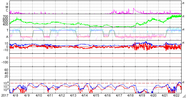 - 2017/ 5/ 9 12:16 太陽風、磁気圏は穏やかに推移しています。4月の黒点相対数は、32.6 でした。
