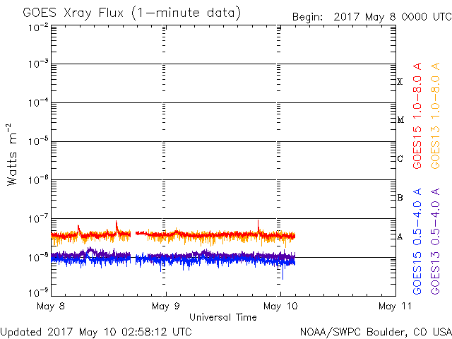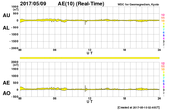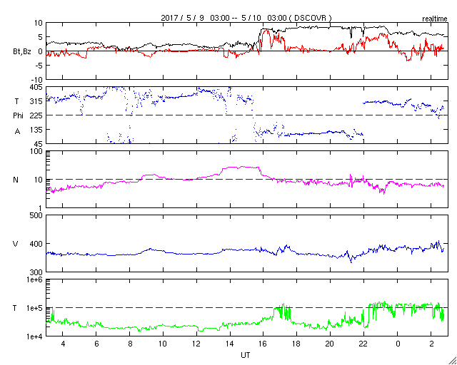 - 2017/ 5/ 8 13:04 低速の太陽風が続いていますが、磁気圏はやや活動的です。フィンランドのオーロラをどうぞ。