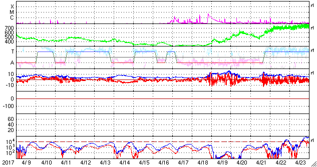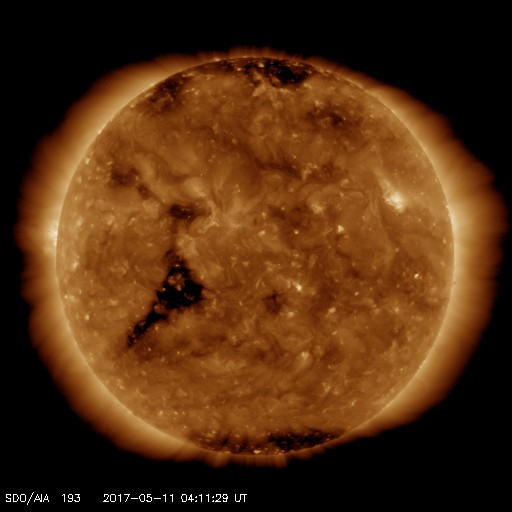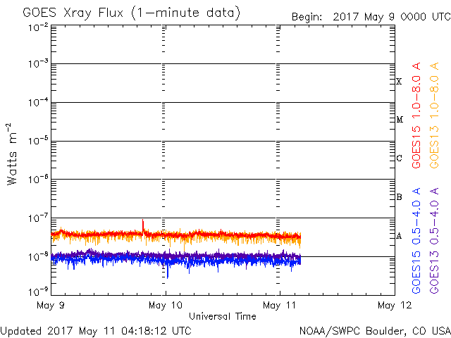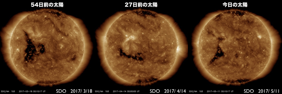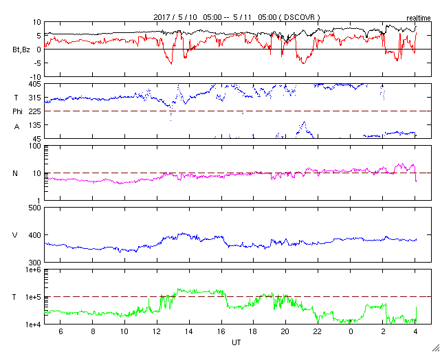 2017/ 5/11 13:18 更新 太陽風はやや低速で、磁気圏も穏やかです。太陽は無黒点です。 担当 篠原 太陽風は、380km/秒とやや低速の風が続いています。 磁場強度は、5nTと平均的な状態から、 グラフの後半は7〜8nTへ少し強まっています。 全体としては、太陽風は穏やかな状態が続いています。 太陽風磁場の南北成分は、 北寄りに推移していますが、時々、南向きに変化しています。 この影響で、磁気圏の活動も時間をおいて少しだけ高まっていて、 AE指数は200nTくらいの小さい変化が時々起きています。 SDO衛星AIA193の太陽コロナ写真では、 太陽の東側(左側)に三角の形をしたコロナホールが見えています。 3月(54日前)、4月(27日前)の写真と比較すると、 コロナホールの広がりは、54日前の3月の頃に似ています。 27日前は、このコロナホールによる太陽風の変化はあまり見られず、 しばらく遅れて速度の高まりがやって来ました。 一方、54日前は、この写真の3日後から太陽風の高まりが始まっています。 今回はどちらに似た変化をするでしょうか。 5月14日頃から注目して下さい。 太陽は、今日も黒点の見えない状態です。 X線のグラフも変化はなく、とても静かです。