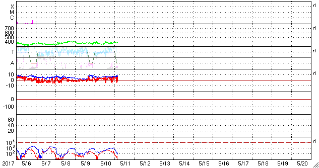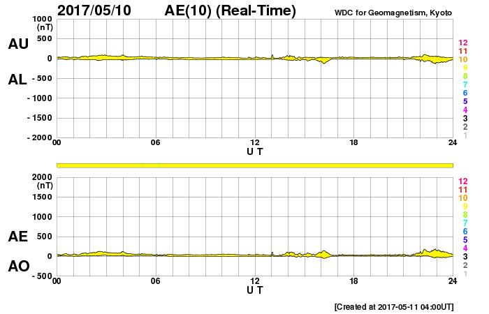 (c) SDO (NASA)、作図:宇宙天気ニュース ![]() 世界時5月10日のAE指数(速報値)。 (c) 京都大学WDC ![]() 世界時5月11日のAE指数(速報値)。 (c) 京都大学WDC ![]() SDO衛星のAIA193カメラによる太陽コロナの様子 (c) SDO (NASA) ![]() SDO衛星による太陽の可視光写真 (c) SDO (NASA) ![]() DSCOVRが観測した太陽風の磁場(1番上の枠、黒線は全体の強度、赤線は南北成分) および、太陽風の密度(3番目の紫線)、速度(4番目の青線) (c) データ:NOAA/SWPC、作図:宇宙天気ニュース ![]() 27日の太陽周期に合わせたデータプロット 太陽が同じ面を地球に向けていた27日前の変化から、今後を予想することができます。 (c) 作図:宇宙天気ニュース