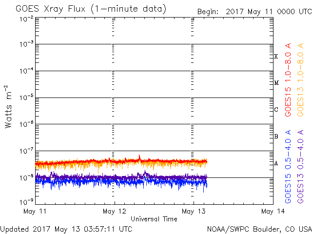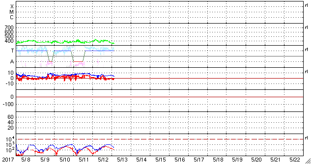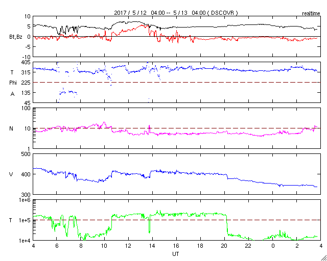 - 2017/ 5/12 12:31 太陽風磁場が北寄りのため、磁気圏は穏やかです。