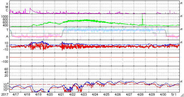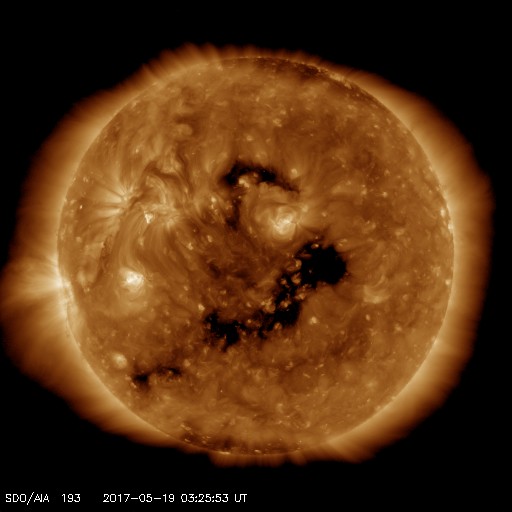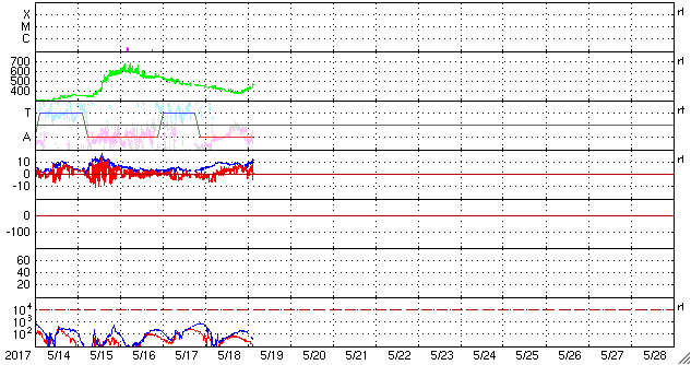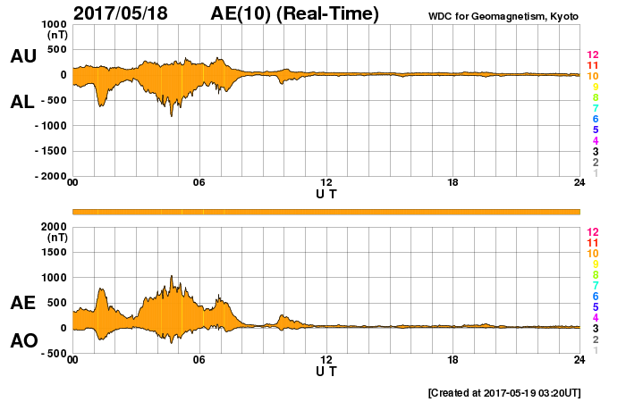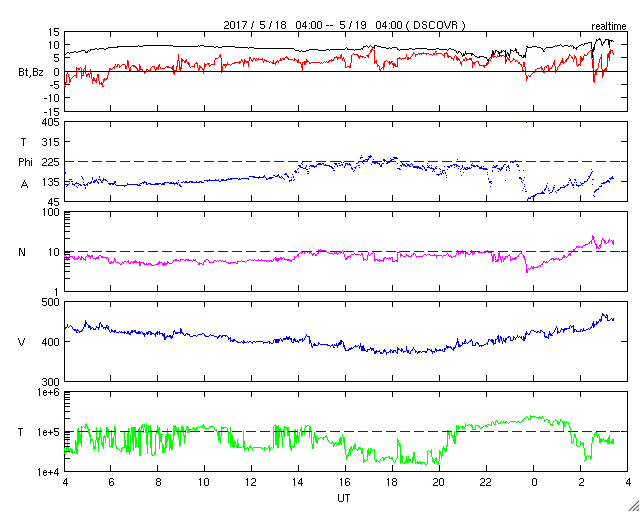 2017/ 5/19 12:31 更新 太陽風がやや高速になっています。速度は更に高まる可能性があります。 担当 篠原 太陽風は、昨日のニュース以降、 磁場強度が10nTへ高まりました。 未明から今朝にかけて、強度はやや下がりましたが、 現在は再び10nTに強まっています。 一方、太陽風の速度は、 今朝にかけて400km/秒前後を推移していたのですが、 19日9時(世界時19日0時)くらいから高まり始め、 現在は450km/秒とやや高速になっています。 SDO衛星AIA193の太陽写真に見えているコロナホールの影響が、 少し早めに始まったのかもしれません。 その場合、磁場強度が高まっているので、 速度は更に上昇を続ける可能性があります。 太陽風磁場の南北成分は、北寄りに推移しています。 このため、磁気圏の活動は穏やかで、 AE指数は18日の図の後半以降変化がなくなっています。 現在、太陽風の磁場強度と速度が高まってきているので、 今後、磁場が南向きの傾向に変わった場合、 磁気圏の活動も強まりやすくなっています。 太陽は、南東側(左下)に現れた黒点に、 2658群と番号が付けられています。 2つの黒点群に目立った活動はなく、太陽は穏やかです。 ![]() 世界時5月18日のAE指数(速報値)。 (c) 京都大学WDC ![]() 世界時5月19日のAE指数(速報値)。 (c) 京都大学WDC ![]() SDO衛星のAIA193カメラによる太陽コロナの様子 (c) SDO (NASA) ![]() SDO衛星による太陽の可視光写真。マウスの矢印を写真に重ねると、黒点番号付きの写真に切り替わります。 (c) SDO (NASA) ![]() DSCOVRが観測した太陽風の磁場(1番上の枠、黒線は全体の強度、赤線は南北成分) および、太陽風の密度(3番目の紫線)、速度(4番目の青線) (c) データ:NOAA/SWPC、作図:宇宙天気ニュース ![]() 27日の太陽周期に合わせたデータプロット 太陽が同じ面を地球に向けていた27日前の変化から、今後を予想することができます。 (c) 作図:宇宙天気ニュース