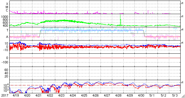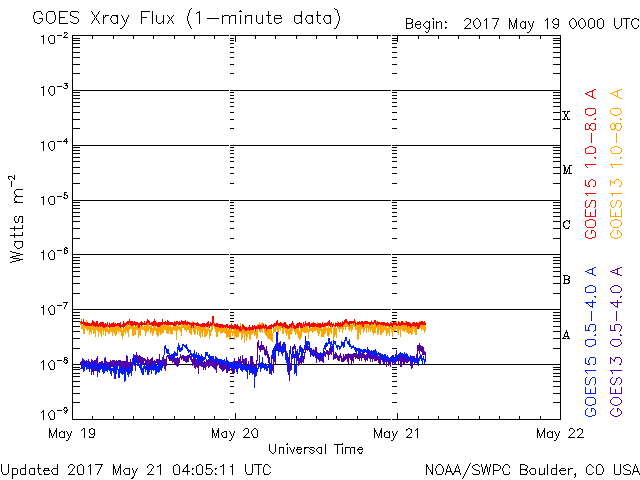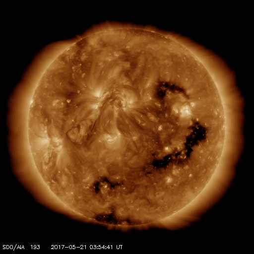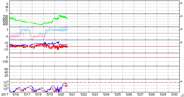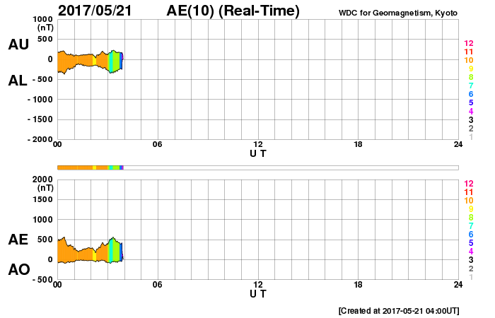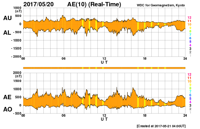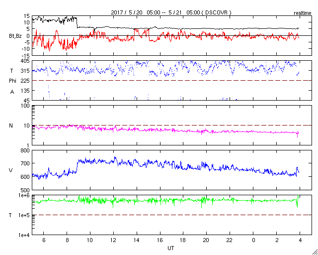 2017/ 5/21 13:05 更新 太陽風の速度は700km/秒まで高まりました。磁気圏の活動も強まっています。 担当 篠原 太陽風の速度は、 昨日の夕方、20日18時(世界時20日9時)に、 600km/秒から700km/秒へ高まり、更に高速の状態になりました。 昨日いっぱいは700km/秒台を保っていましたが、 その後はゆっくりと低下が続き、現在は、600km/秒近くに戻っています。 依然、高速の状態は続いています。 太陽風の磁場強度は、 昨夕の速度の高まりの前に15nT近くまで強まりましたが、 速度の上昇後は5nTヘ下がり、以降、平均的な状態を保っています。 太陽風磁場の南北成分は、 昨日のニュース以降、南寄りに傾向が変わり、 昨夜にかけて、-5nT前後の南向きが続きました。 このため、磁気圏の活動は強まって、 AE指数は1000nTに達する大きい変化が繰り返し発生しています。 今日に入ると、磁場の南北成分は0nT付近で小さく変化するようになり、 磁気圏の活動は続いていますが、 AE指数の変化は500nT程度と、規模は少し小さくなっています。 SDO衛星AIA193を見ると、 コロナホールは、全体が太陽の西側に移動しています。 4日後くらいには、太陽風は平均的な状態に戻っているかもしれません。 太陽は、2つの黒点群が見えています。 特に活動はなく、太陽は穏やかです。 放射線帯の高エネルギー電子が増え始めています。 GOES15(青線)は、10,000の線に近づいていて、 明日には10,000を超えているかもしれません。