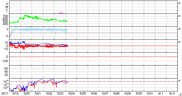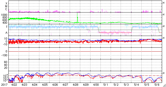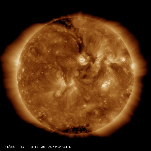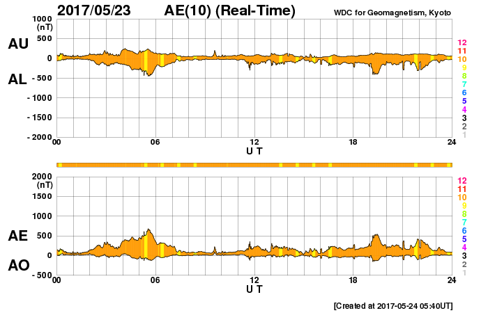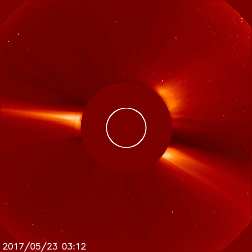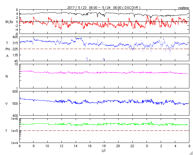 2017/ 5/24 14:59 更新 弱いCMEが発生しました。太陽風は500km/秒の高速風が続いています。 担当 篠原 昨日、23日15時(世界時23日6時)頃、 太陽の西(右)に向かって淡いCMEの噴出が発生しました。 SOHO衛星LASCO C2、C3の動画を掲載します。 太陽のどちら側で発生した現象か調べるため、 SDO衛星のAIAの画像を調べたのですが、 対応する現象は特に見つかりませんでした。 このため、太陽の向こう側の現象かと思われたのですが、 STSREO Ahead衛星のCOR2の写真を見ると、 地球の方向に噴出している様です。 元の現象が小規模のため、 SDO衛星の写真ではよく分からなかったのかもしれません。 太陽の右半分を囲むように広がっているので、 地球へも影響が及ぶ可能性があります。 到来まで4〜5日後と考えると、 27〜28日頃の太陽風に磁場の強まりが見られるかもしれません。 小規模の変化に留まると思われますが、 磁場が南向きに強まった場合、 オーロラの活動を活発になる可能性があります。 乱れが到来するかどうか、注目してください。 太陽では、2659黒点群が見えるだけで、 他の3つの黒点群は見えなくなっています。 太陽風は、昨日の夜に500km/秒まで速度が下がり、 現在までこの状態が続いています。 高速の状態は続いていますが、終わりも近づいているようです。 太陽風の磁場強度は、3nTへ下がっています。 南北成分は南寄りに小さい変化が続き、 磁気圏でも小規模の活動が続いているようです。 SDO衛星AIA193の太陽コロナ写真では、 目立ったコロナホールは見られず、 太陽風はこの後穏やかになっていきそうです。 27日周期の図でも、 前周期は5月14日まで穏やかな太陽風が続いています。 ![]() 23日15時(世界時23日6時)に発生したCME。SOHO衛星LASCO C2、C3。 (c) SOHO (ESA & NASA)、 (動画加工 : 宇宙天気ニュース) ![]() 世界時5月23日のAE指数(速報値)。 (c) 京都大学WDC ![]() 世界時5月24日のAE指数(速報値)。 (c) 京都大学WDC ![]() SDO衛星のAIA193カメラによる太陽コロナの様子 (c) SDO (NASA) ![]() SDO衛星による太陽の可視光写真。マウスの矢印を写真に重ねると、黒点番号付きの写真に切り替わります。 (c) SDO (NASA) ![]() GOES衛星の太陽X線データ (c) NOAA/SWPC ![]() DSCOVRが観測した太陽風の磁場(1番上の枠、黒線は全体の強度、赤線は南北成分) および、太陽風の密度(3番目の紫線)、速度(4番目の青線) (c) データ:NOAA/SWPC、作図:宇宙天気ニュース ![]() 27日の太陽周期に合わせたデータプロット 太陽が同じ面を地球に向けていた27日前の変化から、今後を予想することができます。 (c) 作図:宇宙天気ニュース