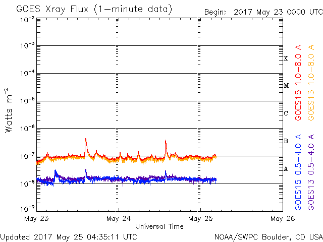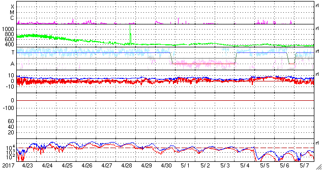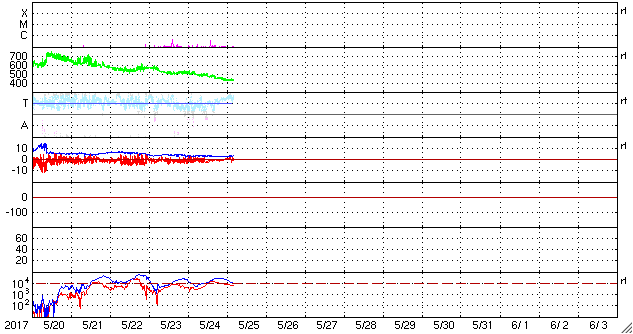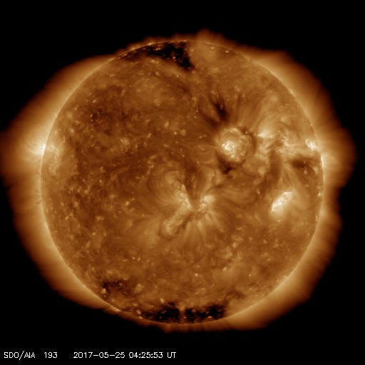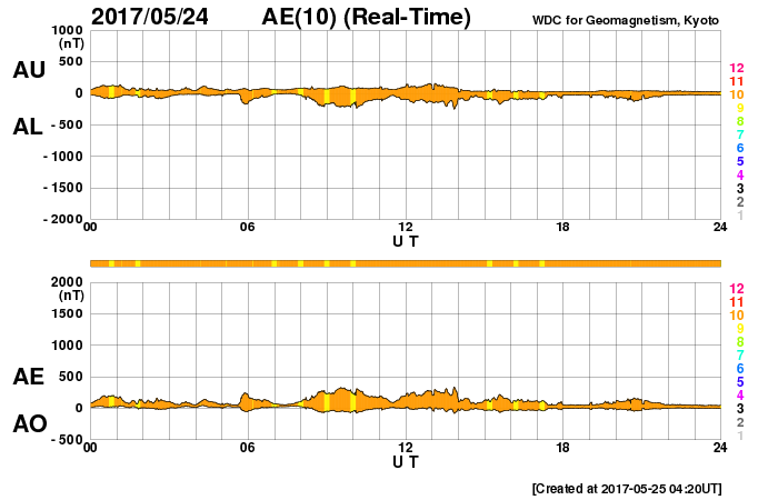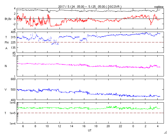 2017/ 5/25 13:36 更新 高速の太陽風は終わり、磁気圏も穏やかです。 担当 篠原 昨日の夜に、太陽風の速度は500km/秒を割り、 現在は440km/秒まで下がっています。 高速太陽風は終わったようです。 27日周期の図を見ると、前周期とほぼ同じタイミングです。 太陽風の磁場強度は、3nTとやや弱まった状態で安定しています。 南北成分は、弱い南向きから、 次第に0nT付近で変化するように変わっています。 速度が下がってきたこともあり、 磁気圏の活動は次第に静かになっています。 この後、昨日お知らせしたCMEの影響がやって来る可能性がありますが、 SDO衛星AIA193の写真ではコロナホールは特に見られず、 前周期の変化を参考にすると、 太陽風は二週間以上にわたって、穏やかな状態が続きそうです。 太陽は目立った活動はなく、静穏です。 放射線帯の高エネルギー電子は、 10,000を超えて高まっていますが、 高速太陽風が終わったので、次第に減少していくでしょう。 ![]() 世界時5月24日のAE指数(速報値)。 (c) 京都大学WDC ![]() 世界時5月25日のAE指数(速報値)。 (c) 京都大学WDC ![]() SDO衛星のAIA193カメラによる太陽コロナの様子 (c) SDO (NASA) ![]() SDO衛星による太陽の可視光写真。マウスの矢印を写真に重ねると、黒点番号付きの写真に切り替わります。 (c) SDO (NASA) ![]() DSCOVRが観測した太陽風の磁場(1番上の枠、黒線は全体の強度、赤線は南北成分) および、太陽風の密度(3番目の紫線)、速度(4番目の青線) (c) データ:NOAA/SWPC、作図:宇宙天気ニュース ![]() 27日の太陽周期に合わせたデータプロット 太陽が同じ面を地球に向けていた27日前の変化から、今後を予想することができます。 (c) 作図:宇宙天気ニュース