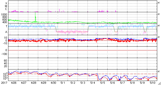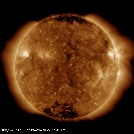 (c) 情報通信研究機構、(動画加工 : 宇宙天気ニュース) ![]() 世界時5月27日のAE指数(速報値)。 (c) 京都大学WDC ![]() 世界時5月28日のAE指数(速報値)。 (c) 京都大学WDC ![]() Dst指数(速報値)。Dst指数は -107nTまで強まり、中規模の磁気嵐が発生している。 (c) 京都大学WDC ![]() SDO衛星のAIA193カメラによる太陽コロナの様子 (c) SDO (NASA) ![]() SDO衛星による太陽の可視光写真。マウスの矢印を写真に重ねると、黒点番号付きの写真に切り替わります。 (c) SDO (NASA) ![]() DSCOVRが観測した太陽風の磁場(1番上の枠、黒線は全体の強度、赤線は南北成分) および、太陽風の密度(3番目の紫線)、速度(4番目の青線) (c) データ:NOAA/SWPC、作図:宇宙天気ニュース ![]() 27日の太陽周期に合わせたデータプロット 太陽が同じ面を地球に向けていた27日前の変化から、今後を予想することができます。 (c) 作図:宇宙天気ニュース