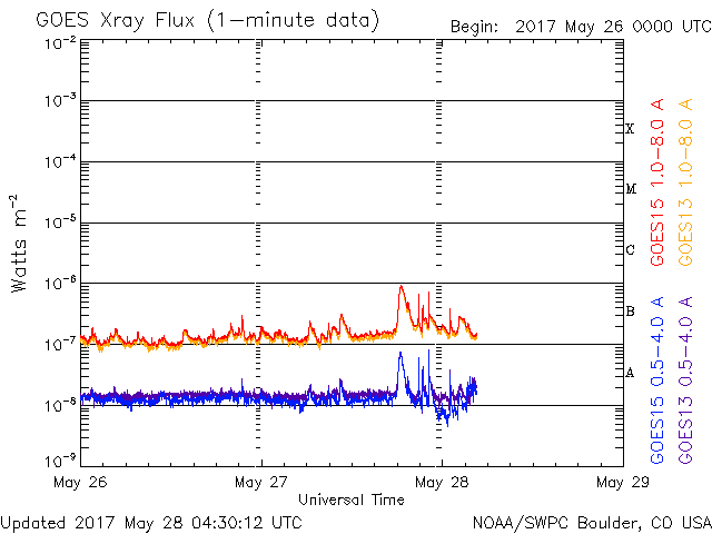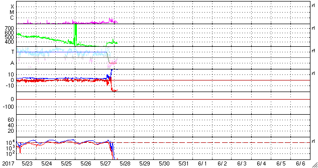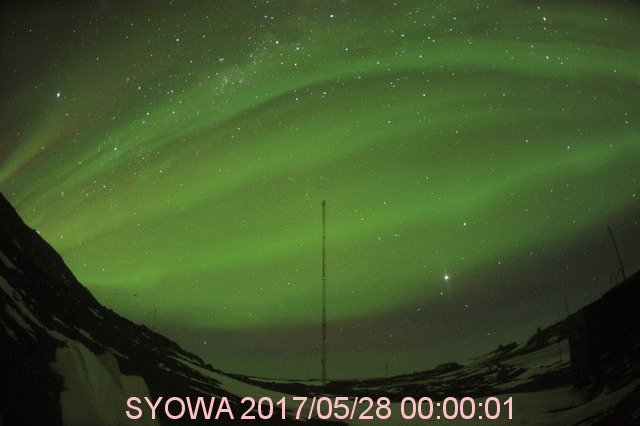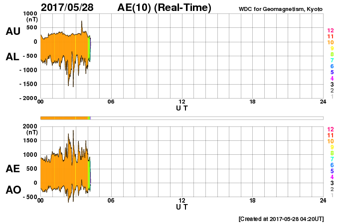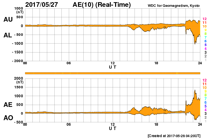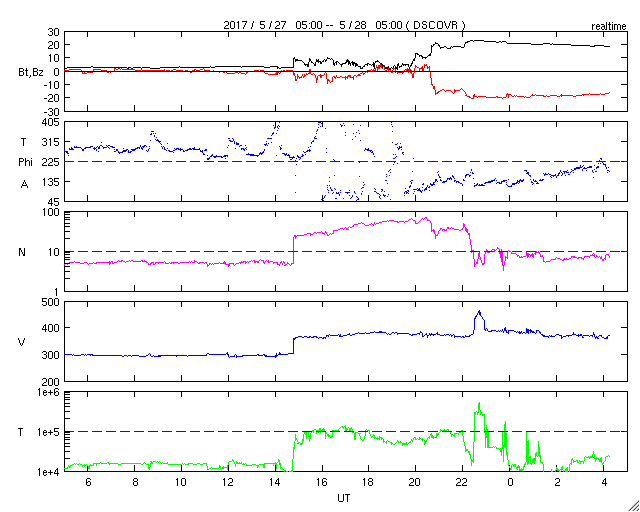 2017/ 5/28 13:30 更新 太陽風の磁場が南向きに強まり、磁気圏の活動が激しくなっています。 担当 篠原 28日0時(世界時27日15時)に、 太陽風の乱れがDSCOVR衛星に到達し、 速度は、300km/秒から350km/秒に、 磁場強度は、3nTから7nTに強まる、小規模の変化が発生しました。 この時は、変化が小さかったため、 AE指数は400nTと小規模の変化が発生した程度で、 磁気圏は特に乱れませんでした。 しかし、今朝、28日6時(世界時27日21時)以降、 磁場強度は20nTに強まり、 南北成分も、-15〜 -20nTという強い南向きの変化が発生し、 現在も続いています。 太陽風の速度は、370km/秒とやや低速に留まっていますが、 磁気圏では激しい変化が発生して、 AE指数は1000nTを超え、 1800nTに達する大きい変化も記録しています。 活動が激しくなった頃、世界時28日0〜6時の 南極昭和基地のオーロラの様子を動画で紹介します。 また、速報値ですが、Dst指数は、-107nTに下がり、 中規模の磁気嵐が発生しています。 Dst指数が -100nTを超えるのは、2016年10月13日以来で、 およそ7か月ぶりです。 太陽風の速度が比較的遅いため、 太陽風の乱れもゆっくりと通過していることになります。 乱れがどこまで続くか、注目してください。 太陽では、2659黒点群が少し発達し、 B9、B7とCクラスに近い規模の小さいフレアを起こしています。 2659群は西の端に近づいていて、やがて見えなくなるでしょう。 放射線帯の高エネルギー電子は、 太陽風の乱れを受けて大きく減少しています。 この後、増加に転じるでしょうか。