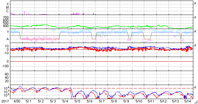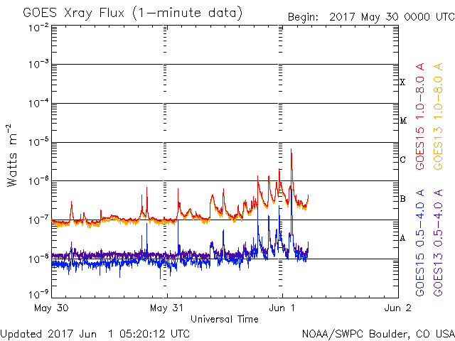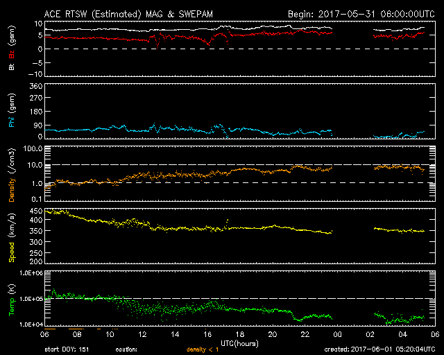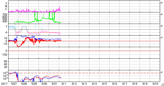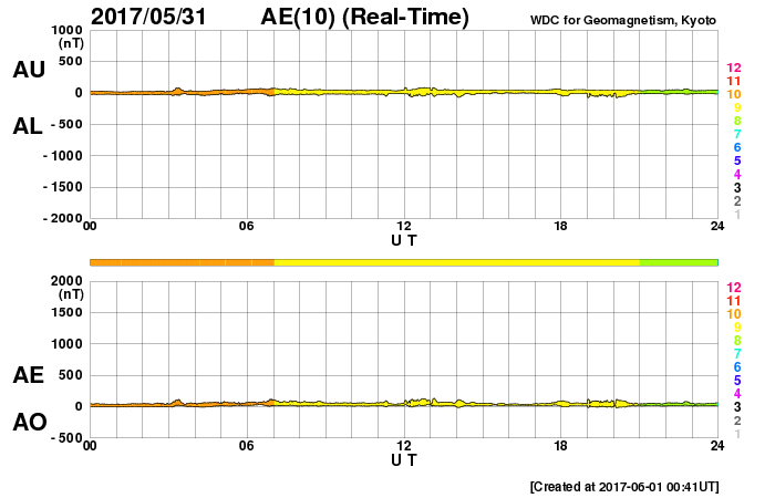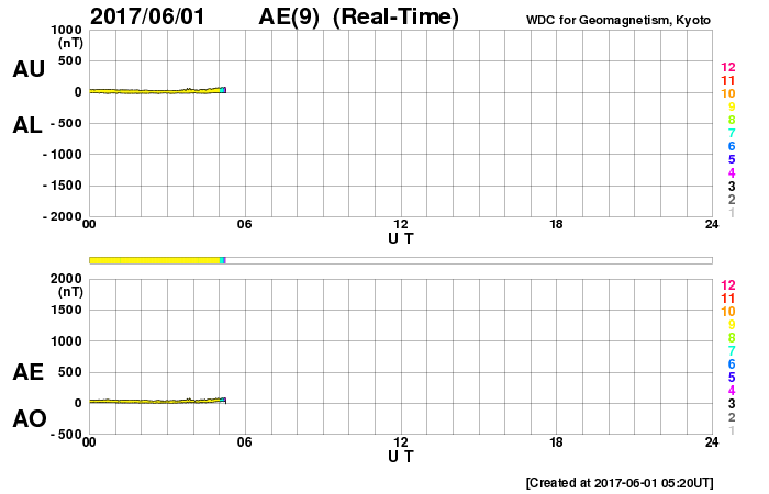 (c) SDO (NASA)、(動画加工 : 宇宙天気ニュース) ![]() 太陽の東端のフレア活動の様子。SDO衛星AIA131。 (c) SDO (NASA)、(動画加工 : 宇宙天気ニュース) ![]() 世界時5月31日のAE指数(速報値)。 (c) 京都大学WDC ![]() 世界時6月1日のAE指数(速報値)。 (c) 京都大学WDC ![]() SDO衛星のAIA193カメラによる太陽コロナの様子 (c) SDO (NASA) ![]() SDO衛星による太陽の可視光写真。マウスの矢印を写真に重ねると、黒点番号付きの写真に切り替わります。 (c) SDO (NASA) ![]() GOES衛星の太陽X線データ (c) NOAA/SWPC ![]() ACEが観測した太陽風の磁場(1番上の枠、白線は全体の強度、赤線は南北成分) および、太陽風の密度(3番目の橙線)、速度(4番目の黄線) (c) NOAA/SWPC ![]() 27日の太陽周期に合わせたデータプロット 太陽が同じ面を地球に向けていた27日前の変化から、今後を予想することができます。 (c) 作図:宇宙天気ニュース