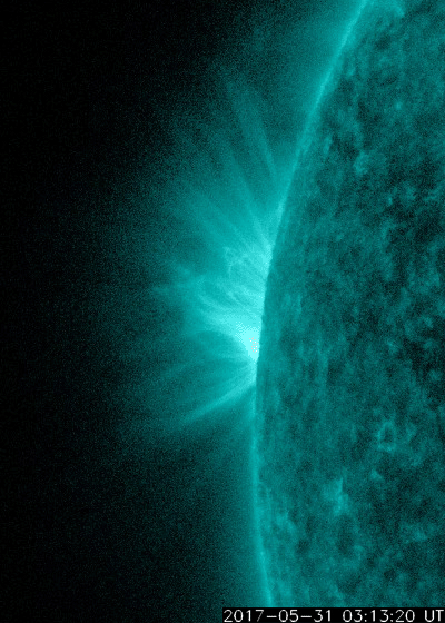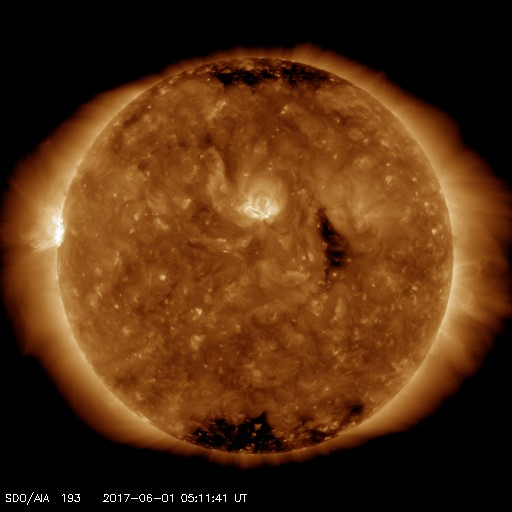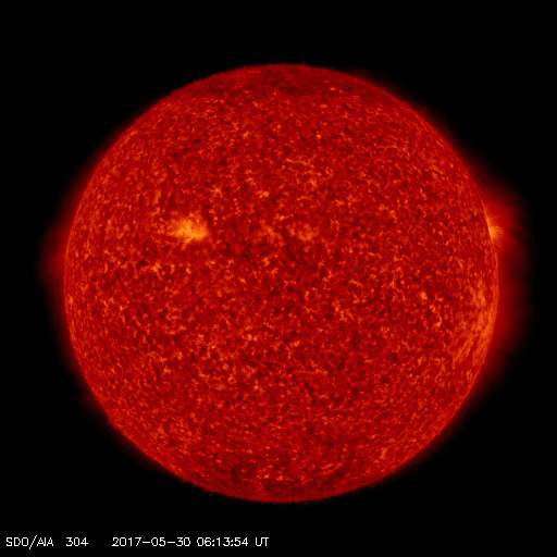 2017/ 6/ 1 14:20 更新 太陽の東端でC6.6の小規模フレアが発生しました。太陽風は低速です。 担当 篠原 一昨日の夜、30日21時(世界時30日12時)頃に、 太陽の中央部の東寄り(左寄り)で、フィラメント噴出が発生しました。 SDO衛星AIA304の動画を掲載します。 黒い筋状に見えるダーク・フィラメントが、 ゆっくりと太陽から噴き出しています。 この現象によりCME(太陽ガスの放出現象)が噴出したと考えられ、 発生位置から地球方向にも向かう可能性があります。 しかし、SOHO衛星LASCO C3の写真では、 東側(左側)に向かってとても淡いガスが飛び出す様子しか見られず、 Spaceweather.comは、地球にはやって来ないだろうと伝えています。 実際にどうなるか、5日後の6月4〜5日頃の太陽風に注目してください。 また、太陽の東端から黒点が出現し(2661群と番号が付けられています)、 今日未明より、C1.3、C1.3、C2.0とCクラスのフレアを起こすようになり、 1日10時(世界時1日1時)には、C6.6の小規模フレアが発生しています。 活動の様子を、SDO衛星AIA131の動画で紹介します。 今後の活動に注目してください。 太陽風は、350km/秒に速度が下がり、低速の風に変わっています。 磁場強度は、7nTとやや強まった状態です。 磁場の南北成分は、北向きで推移しています。 このため、磁気圏は静穏で、 AE指数はほとんど変化が見られません。 SDO衛星AIA193では、 小規模のコロナホールが中央部の西側に見える程度で、 太陽風は、基本的には穏やかに推移しそうです。