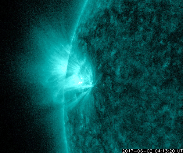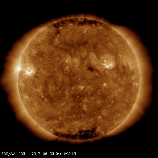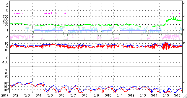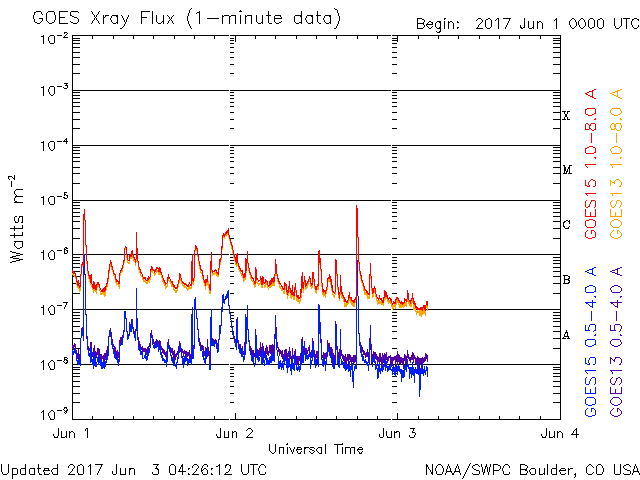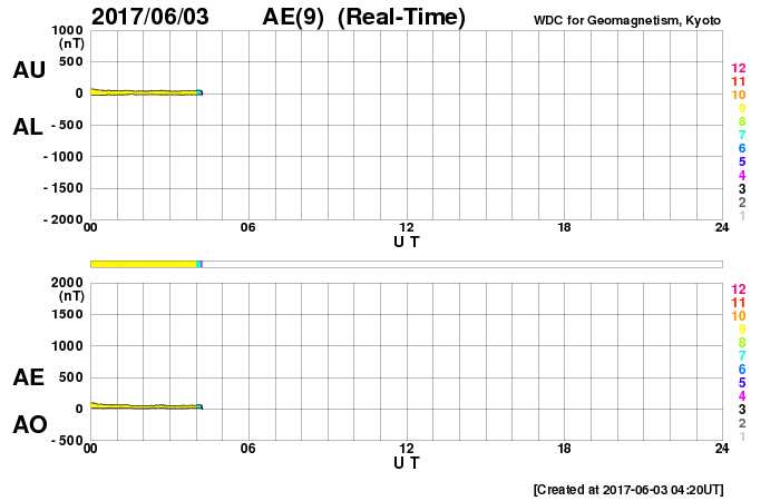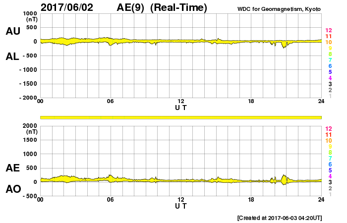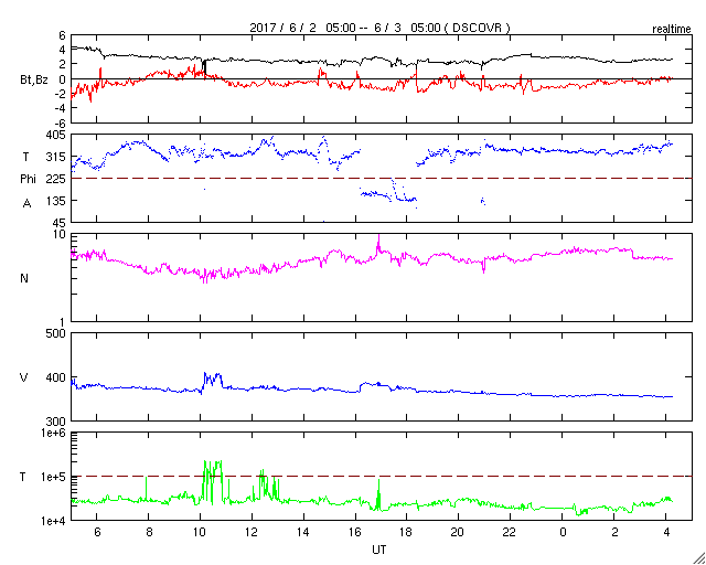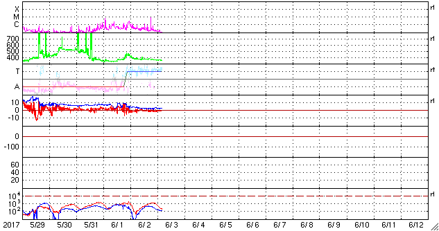 2017/ 6/ 3 13:26 更新 C8.0の小規模フレアが発生しました。太陽風は低速です。 担当 篠原 2661黒点群のフレアの活動は続き、 今日、3日3時(世界時2日18時)に、C8.0の小規模フレアが発生しました。 C8に達する規模のフレアの発生は、4月3日のM1.2以来で、2か月ぶりです。 2661群の活動の様子をSDO衛星AIA131の動画で紹介します。 24時間分を動画にしていて、C8.0のフレアは動画の中ほどで発生しています。 X線のグラフの強度は、C8.0のフレア以降は下がり気味です。 2661群の活動は落ち着いて行くのか、この後も続くのか、 引き続き注目してください。 太陽風は、速度が350km/秒へ下がり、低速の風になっています。 磁場強度も2〜3nTへ下がり、弱まっています。 磁場の南北成分は、南寄りになっていますが、変化は小さく、 磁気圏は穏やかで、AE指数は小さい変化が時々見られる程度です。 SDO衛星AIA193の太陽写真では、コロナホールは特に見られず、 太陽風は基本的には穏やかな状態が続くでしょう。 ![]() C8.0フレアを起こした2661黒点群の活動の様子。SDO衛星AIA131。 (c) SDO (NASA)、(動画加工 : 宇宙天気ニュース) ![]() 世界時6月2日のAE指数(速報値)。 (c) 京都大学WDC ![]() 世界時6月3日のAE指数(速報値)。 (c) 京都大学WDC ![]() SDO衛星のAIA193カメラによる太陽コロナの様子 (c) SDO (NASA) ![]() SDO衛星による太陽の可視光写真。マウスの矢印を写真に重ねると、黒点番号付きの写真に切り替わります。 (c) SDO (NASA) ![]() GOES衛星の太陽X線データ (c) NOAA/SWPC ![]() DSCOVRが観測した太陽風の磁場(1番上の枠、黒線は全体の強度、赤線は南北成分) および、太陽風の密度(3番目の紫線)、速度(4番目の青線) (c) データ:NOAA/SWPC、作図:宇宙天気ニュース ![]() 27日の太陽周期に合わせたデータプロット 太陽が同じ面を地球に向けていた27日前の変化から、今後を予想することができます。 (c) 作図:宇宙天気ニュース