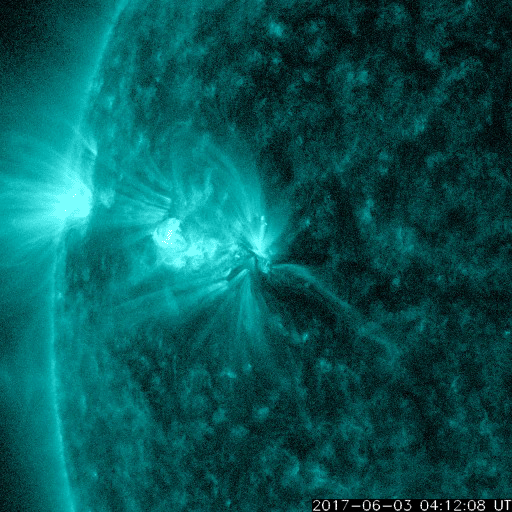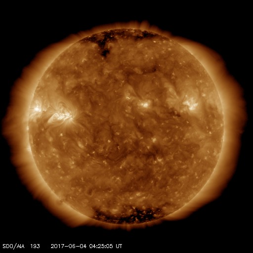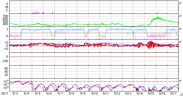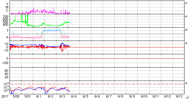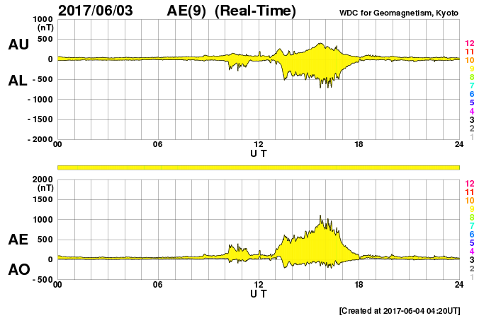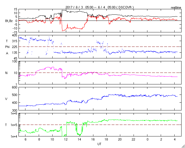 2017/ 6/ 4 13:37 更新 太陽風は高速風に変わっています。ニュージーランドのオーロラをどうぞ。 担当 篠原 ニュージーランドに滞在中の高坂雄一さんより、 昨夜、現地4日1時過ぎ(世界時3日13時過ぎ)に撮影されたばかりの オーロラ写真をいただきました。 現地は天候が悪かったそうで、 南島の内陸から南の海岸線まで移動してチャンスを待つと (到着時は雨だったそうです)、 深夜23時頃から晴れ始め、 月の入り前の4日1時頃からオーロラが現れ始めたそうです。 そのまま朝明るくなるまでオーロラは続いていたそうですが、 光はとても微弱で、肉眼ではほとんど分からなかったそうです。 送っていただいた写真でも、 地平線近くにうっすらとオーロラの光が見えている程度です。 昨夜の太陽風のデータを見ると、 日本時間3日17時(世界時3日8時)から磁場強度が強まり始め、 3日20時(世界時3日11)時頃には、15nT近くまで強まっています。 この時に南北成分が大きく南向きに変化して、 -10nTの強い南向きが3時間ほど続きました。 太陽風の速度も、400km/秒と平均的な速さに戻っていて、 磁気圏の活動は急に高まり、 AE指数では、500〜1000nTの中規模の活動が4時間ほど発生しました。 世界時では、3日13時から17時にかけてとなっていて、 高坂さんがニュージーランドで観測していた、まさにそのタイミングです。 この後、太陽風磁場の南北成分は北寄りに変わり、 磁気圏の活動は止まってしまいました。 晴れ間を探しての大移動が見事に実を結んだのでしょう。 写真では、オーロラとともに南天の天の川、南十字星、大・小マゼラン雲と 美しい星々も見えています。 貴重な機会を捉えた素晴らしい写真をありがとうございます。 太陽風の速度は、その後更に高まって、 今日の未明以降500km/秒と高速風に変わっています。 小さく見えていたコロナホールの影響がやって来たのでしょうか。 前周期は見られなかった変化です。 どこまで続くのか注目してください。 太陽では2661黒点群でフレアの発生が続いています。 昨夜から今朝にかけて、C2.1、C2.5、C2.5と、 同じくらいの大きさの小規模フレアが3回連続で発生しました。 SDO衛星AIA131の動画を掲載します。 その後もBクラスの小さい活動が起きていて、 引き続き2661群に注目してください。 ![]() ニュージーランド南島の南岸で、現地4日1時過ぎ(世界時3日13時過ぎ)に撮影されたオーロラ。 (c) 高坂雄一氏 ![]() ニュージーランド南島の南岸で、現地4日1時過ぎ(世界時3日13時過ぎ)に撮影されたオーロラ。 (c) 高坂雄一氏 ![]() ニュージーランド南島の南岸で、現地4日1時過ぎ(世界時3日13時過ぎ)に撮影されたオーロラ。 (c) 高坂雄一氏 ![]() 2661黒点群で、Cクラスの小規模フレアが続いている。SDO衛星AIA131。 (c) SDO (NASA)、(動画加工 : 宇宙天気ニュース) ![]() 世界時6月3日のAE指数(速報値)。 (c) 京都大学WDC ![]() 世界時6月4日のAE指数(速報値)。 (c) 京都大学WDC ![]() SDO衛星のAIA193カメラによる太陽コロナの様子 (c) SDO (NASA) ![]() SDO衛星による太陽の可視光写真。マウスの矢印を写真に重ねると、黒点番号付きの写真に切り替わります。 (c) SDO (NASA) ![]() DSCOVRが観測した太陽風の磁場(1番上の枠、黒線は全体の強度、赤線は南北成分) および、太陽風の密度(3番目の紫線)、速度(4番目の青線) (c) データ:NOAA/SWPC、作図:宇宙天気ニュース ![]() 27日の太陽周期に合わせたデータプロット 太陽が同じ面を地球に向けていた27日前の変化から、今後を予想することができます。 (c) 作図:宇宙天気ニュース