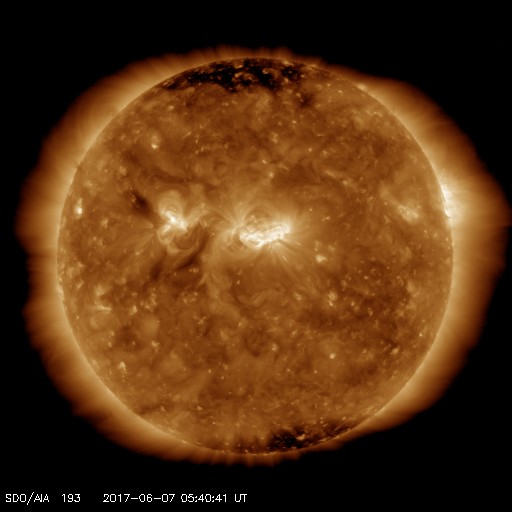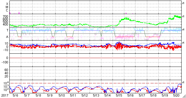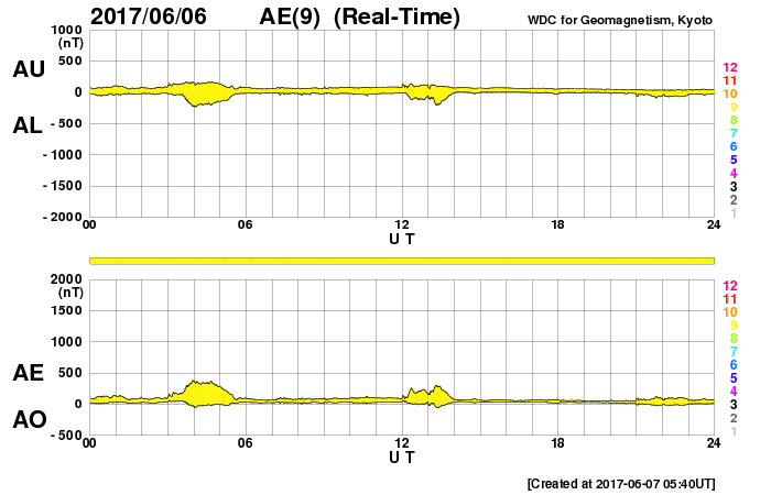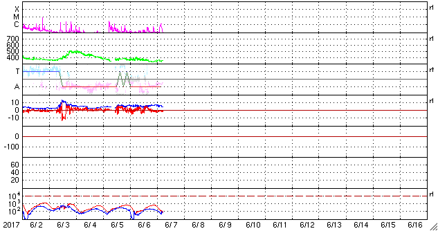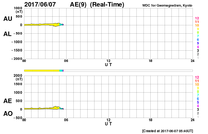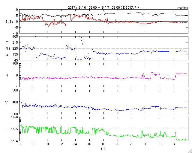 2017/ 6/ 7 14:59 更新 太陽風は低速です。C1の小さいフレアが発生しています。 担当 篠原 太陽風は、350km/秒と低速の風が続いています。 磁場強度は、5〜6nTと平均的な強さで安定しています。 太陽風磁場の南北成分は、 グラフの後半からは、0nT付近で小さく変化する程度です。 磁気圏は基本的には穏やかで、 AE指数は時々小さい変化が見られる程度です。 SDO衛星AIA193の太陽コロナには、コロナホールは特に見られず、 太陽風は穏やかな状態がしばらく続きそうです。 27日周期の図では、 前周期は5月15日から太陽風の強まりが到来していますが、 4日後の6月11日に、この変化は回帰してくるでしょうか。 太陽では、2661黒点群の活動が再び強まって、 今日、7日11時(世界時7日2時)に、 C1.3の小規模フレアが発生しています。 黒点そのものはだいぶ小さくなっています。