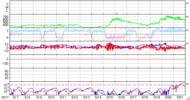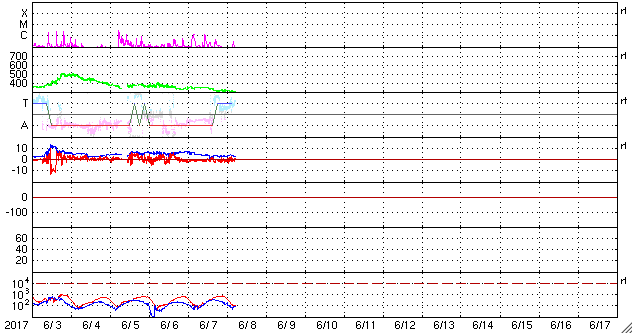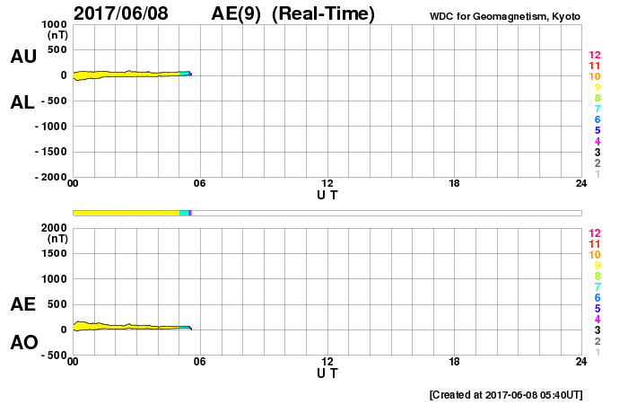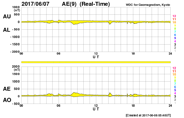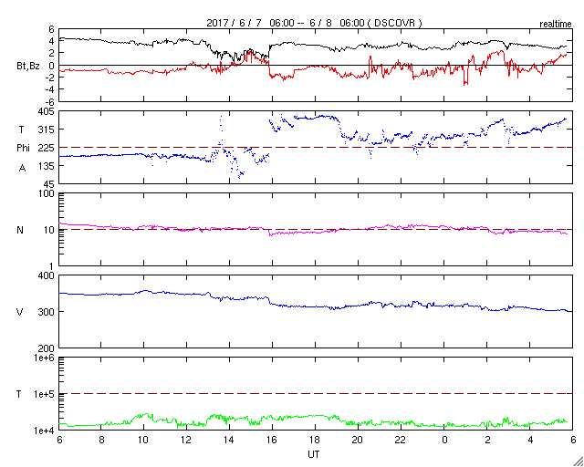 2017/ 6/ 8 14:51 更新 太陽風は更に低速になり、磁気圏も穏やかです。長野県で撮影された大気光を紹介します。 担当 篠原 池田吉則さんより、 5月28日の夜に、長野県上田市の菅平高原で撮影された 大気光の写真を送っていただきました。 池田さんによると、20〜23時(世界時28日11〜13時)にかけて、 天の川を狙って撮影を行ったことろ、 肉眼では見えにくかったそうですが、 戻って写真を現像すると、緑色と赤色の縞模様が写っていたとのことです。 これは、超高層の酸素原子が出している光で、 緑色の光は高度100kmあたり、赤色の光は200kmあたりで起きているそうです。 (知人に教えてもらいました) 発光の仕組み自体はオーロラと同じですが(従って、色も同じです)、 昼間に当たっていた太陽光の紫外線がエネルギー源になっていて、 宇宙から降ってきた粒子の衝突が原因のオーロラとは、この点が違います。 大気中を伝わる波動が起こす現象なので、波の縞模様が見えています。 背景の星の位置を基準にして、掲載の写真の1枚目と2枚目を比べると、 縞模様は左に向かって進んでいるように見えます。 大気光やオーロラの発光については、 名古屋大学宇宙地球環境研究所から、 「大気のてっぺん50のなぜ」という解説書が公開されています。 どうぞご覧下さい。 池田さんは、状況を確認するため翌日も撮影に行ったそうですが、 その夜は大気光は写らず、天の川だけがくっきりと写っていたそうです。 オーロラとはまた違った、超高層の自然現象です。 とても美しい写真をありがとうございます。 現在の太陽風は、速度が更に下がって、300km/秒とかなり遅くなっています。 磁場強度も、3nTとやや弱くなっています。 更に穏やかな風になってきました。 磁場の南北成分は、南寄りですが、振れ幅は小さく、 磁気圏は、穏やかな状態が続いています。 SDO衛星AIA193では、コロナホールは特に見られず、 穏やかな太陽風はこの後も続きそうです。 太陽では、2661黒点群は更に淡くなり、 掲載の写真ではかなり見にくくなっています。 太陽では、昨夜、7日19時(世界時7日10時)に、 C1.2の小規模フレアが発生していますが、 2661群ではなく、西の端の沈みかけた領域で起きています。 ![]() 5月28日20〜23時(世界時28日11〜14時)頃に長野県上田市菅平高原で撮影された大気光。 (c) 池田吉則氏 ![]() 5月28日20〜23時(世界時28日11〜14時)頃に長野県上田市菅平高原で撮影された大気光。 (c) 池田吉則氏 ![]() 5月28日20〜23時(世界時28日11〜14時)頃に長野県上田市菅平高原で撮影された大気光。 (c) 池田吉則氏 ![]() 5月28日20〜23時(世界時28日11〜14時)頃に長野県上田市菅平高原で撮影された大気光。 (c) 池田吉則氏 ![]() 世界時6月7日のAE指数(速報値)。 (c) 京都大学WDC ![]() 世界時6月8日のAE指数(速報値)。 (c) 京都大学WDC ![]() SDO衛星のAIA193カメラによる太陽コロナの様子 (c) SDO (NASA) ![]() SDO衛星による太陽の可視光写真。マウスの矢印を写真に重ねると、黒点番号付きの写真に切り替わります。 (c) SDO (NASA) ![]() DSCOVRが観測した太陽風の磁場(1番上の枠、黒線は全体の強度、赤線は南北成分) および、太陽風の密度(3番目の紫線)、速度(4番目の青線) (c) データ:NOAA/SWPC、作図:宇宙天気ニュース ![]() 27日の太陽周期に合わせたデータプロット 太陽が同じ面を地球に向けていた27日前の変化から、今後を予想することができます。 (c) 作図:宇宙天気ニュース