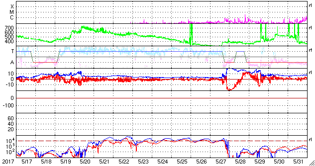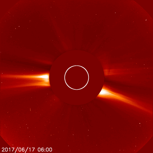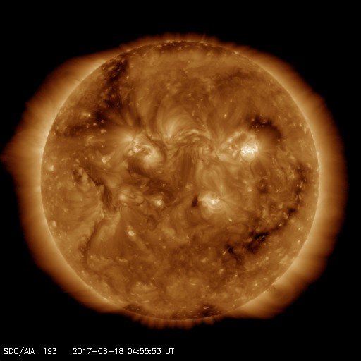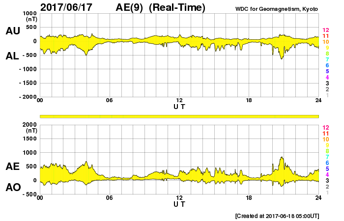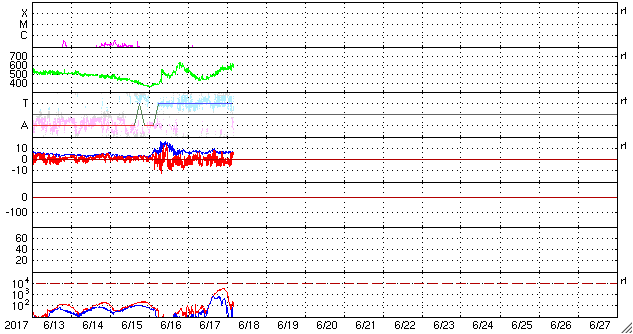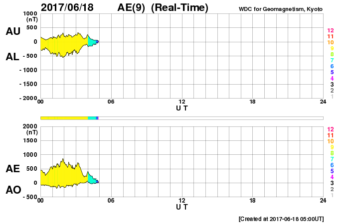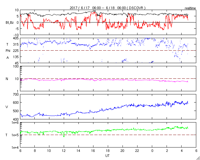 2017/ 6/18 14:04 更新 太陽風の速度は600km/秒に高まっています。磁気圏も活動的です。 担当 篠原 昨夜にかけて450km/秒まで下がった太陽風の速度は、 今日に入ると再び高まって、現在、600km/秒に達しています。 磁場強度は、8nTから5nTへ少し下がり、 平均的な値に戻りかけているようです。 太陽風磁場の南北成分は、南北に切り替わりながら変化しています。 磁気圏の活動は高まった状態が続き、 AE指数は、500〜800nTの中規模の変化が続いています。 SDO衛星AIA193を見ると、 今回の高速風をもたらしたコロナホールは、 太陽の西の端に近づいています。 高速太陽風は次第に弱まっていきそうです。 太陽は、2つの黒点群が見えていますが、 特に活動はなく、穏やかです。 一方、SOHO衛星LASCO C2、C3では、 CME(太陽ガスの放出現象)の噴出が観測されています。 STEREO Ahead衛星のデータを参照すると、 太陽の向こう側でフレアが起きたようです。 ![]() 太陽の向こう側で発生したCME。SOHO衛星LASCO C2、C3。 (c) SOHO (ESA & NASA)、 (動画加工 : 宇宙天気ニュース) ![]() 世界時6月17日のAE指数(速報値)。 (c) 京都大学WDC ![]() 世界時6月18日のAE指数(速報値)。 (c) 京都大学WDC ![]() SDO衛星のAIA193カメラによる太陽コロナの様子 (c) SDO (NASA) ![]() SDO衛星による太陽の可視光写真。マウスの矢印を写真に重ねると、黒点番号付きの写真に切り替わります。 (c) SDO (NASA) ![]() DSCOVRが観測した太陽風の磁場(1番上の枠、黒線は全体の強度、赤線は南北成分) および、太陽風の密度(3番目の紫線)、速度(4番目の青線) (c) データ:NOAA/SWPC、作図:宇宙天気ニュース ![]() 27日の太陽周期に合わせたデータプロット 太陽が同じ面を地球に向けていた27日前の変化から、今後を予想することができます。 (c) 作図:宇宙天気ニュース