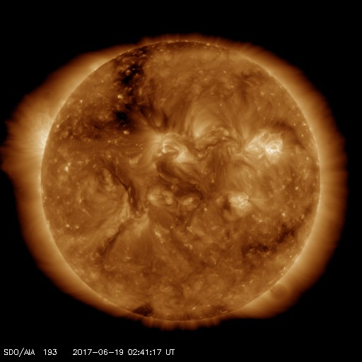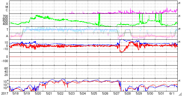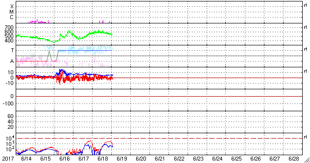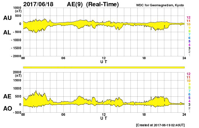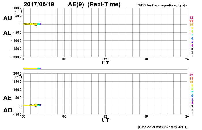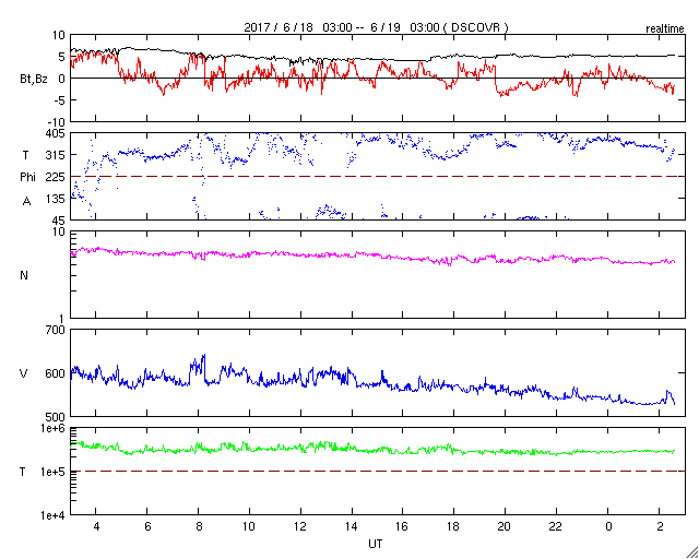 2017/ 6/19 11:48 更新 高速の太陽風は続いていますが、速度は530km/秒に下がっています。 担当 篠原 太陽風の速度は、昨夜にかけて600km/秒近くを保っていましたが、 今日に入った頃から低下に向かい、現在は530km/秒と、 高速の状態は続いていますが、やや落ち着いてきました。 磁場強度は、5nTと平均的な状態が続いています。 太陽風磁場の南北成分は、 0nTを挟んで、南に振れたり北に振れたりしています。 南への振れ幅は小さくなっていますが、速度が高まっているため、 磁気圏の活動は高まった状態が続き、 AE指数のグラフは、500nT前後の変化が頻繁に発生しています。 高速太陽風は弱まり始めているので、 磁気圏の活動も次第に規模が小さくなりそうです。 太陽は、西側(右側)の2663黒点群で、 Bクラスの小さい活動が数回発生しています。 2663群は、黒点は小さくなっていて、 規模は縮小しているようです。 ![]() 世界時6月18日のAE指数(速報値)。 (c) 京都大学WDC ![]() 世界時6月19日のAE指数(速報値)。 (c) 京都大学WDC ![]() SDO衛星のAIA193カメラによる太陽コロナの様子 (c) SDO (NASA) ![]() SDO衛星による太陽の可視光写真。マウスの矢印を写真に重ねると、黒点番号付きの写真に切り替わります。 (c) SDO (NASA) ![]() DSCOVRが観測した太陽風の磁場(1番上の枠、黒線は全体の強度、赤線は南北成分) および、太陽風の密度(3番目の紫線)、速度(4番目の青線) (c) データ:NOAA/SWPC、作図:宇宙天気ニュース ![]() 27日の太陽周期に合わせたデータプロット 太陽が同じ面を地球に向けていた27日前の変化から、今後を予想することができます。 (c) 作図:宇宙天気ニュース