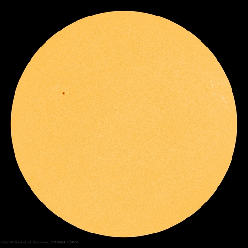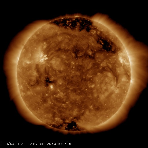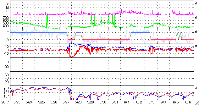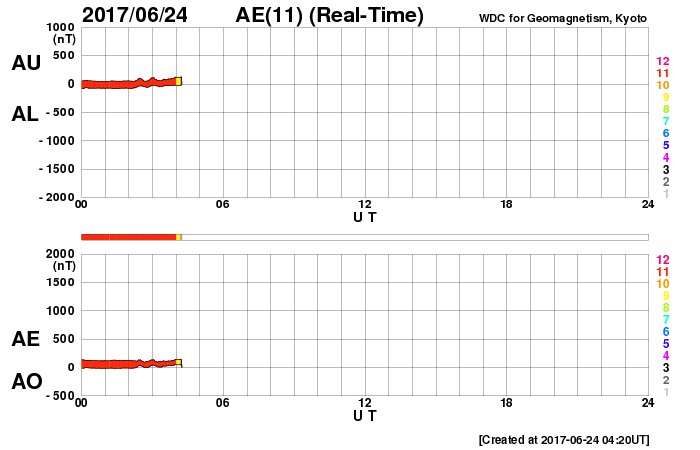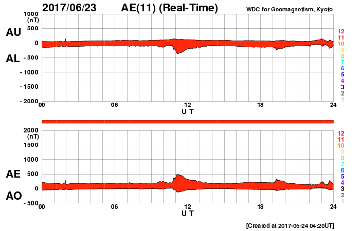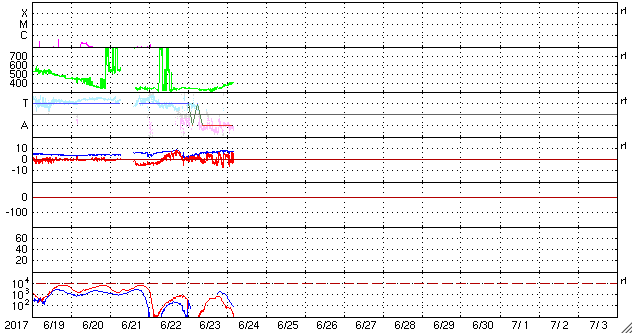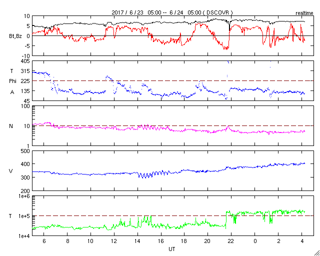 2017/ 6/24 13:27 更新 太陽風は平均的な速度に上がっています。磁気圏は穏やかです。 担当 篠原 太陽風の速度は、320km/秒から400km/秒へゆっくり上がり、 太陽風は平均的な速度に戻っています。 磁場強度は、7nTと少し強まっています。 SDO衛星AIA193の太陽写真の北西(右上)に見える コロナホールの弱い影響がやって来ているのかもしれません。 もう少し速度が高まるのか、この辺りまでなのか、 この後の変化に注目してください。 太陽風磁場の南北成分は、 北を向いたり南に向いたり、変化が続いていますが、 速度が下がっていることもあり、 磁気圏は穏やかな状態が続いています。 AE指数のグラフは、目立った変化は見られません。 SDO衛星AIA193では、 太陽の中央から東側(左側)にかけてコロナホールは見られないため、 この後も穏やかな太陽風が続きそうです。 太陽は、静かな状態が続いています。 ![]() 世界時6月23日のAE指数(速報値)。 (c) 京都大学WDC ![]() 世界時6月24日のAE指数(速報値)。 (c) 京都大学WDC ![]() SDO衛星のAIA193カメラによる太陽コロナの様子 (c) SDO (NASA) ![]() SDO衛星による太陽の可視光写真。マウスの矢印を写真に重ねると、黒点番号付きの写真に切り替わります。 (c) SDO (NASA) ![]() DSCOVRが観測した太陽風の磁場(1番上の枠、黒線は全体の強度、赤線は南北成分) および、太陽風の密度(3番目の紫線)、速度(4番目の青線) (c) データ:NOAA/SWPC、作図:宇宙天気ニュース ![]() 27日の太陽周期に合わせたデータプロット 太陽が同じ面を地球に向けていた27日前の変化から、今後を予想することができます。 (c) 作図:宇宙天気ニュース
