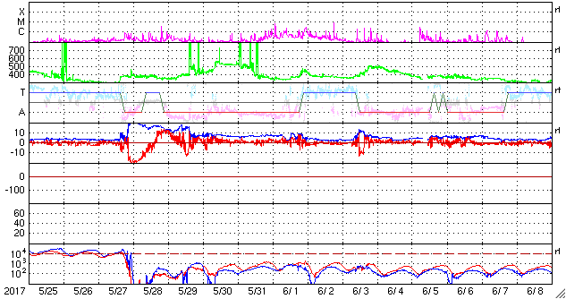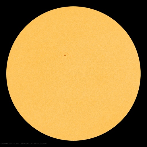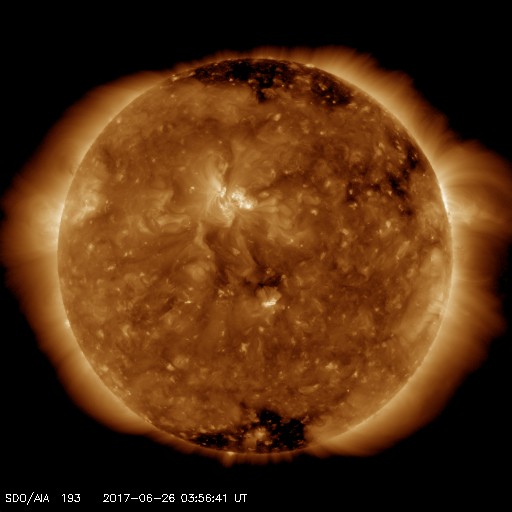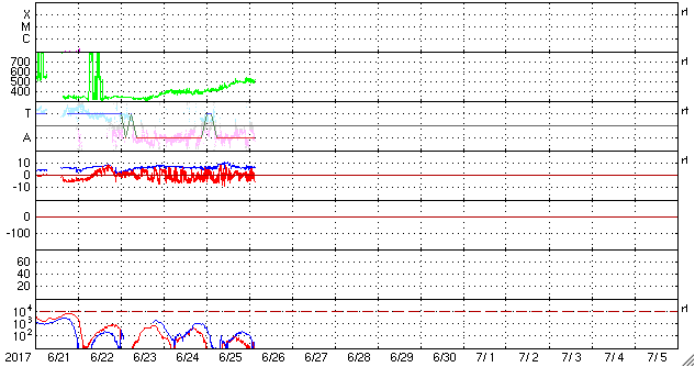 (c) 高坂雄一氏 ![]() 世界時6月25日のAE指数(速報値)。 (c) 京都大学WDC ![]() 世界時6月26日のAE指数(速報値)。 (c) 京都大学WDC ![]() SDO衛星のAIA193カメラによる太陽コロナの様子 (c) SDO (NASA) ![]() SDO衛星による太陽の可視光写真。マウスの矢印を写真に重ねると、黒点番号付きの写真に切り替わります。 (c) SDO (NASA) ![]() DSCOVRが観測した太陽風の磁場(1番上の枠、黒線は全体の強度、赤線は南北成分) および、太陽風の密度(3番目の紫線)、速度(4番目の青線) (c) データ:NOAA/SWPC、作図:宇宙天気ニュース ![]() 27日の太陽周期に合わせたデータプロット 太陽が同じ面を地球に向けていた27日前の変化から、今後を予想することができます。 (c) 作図:宇宙天気ニュース