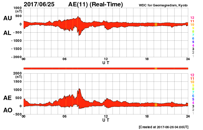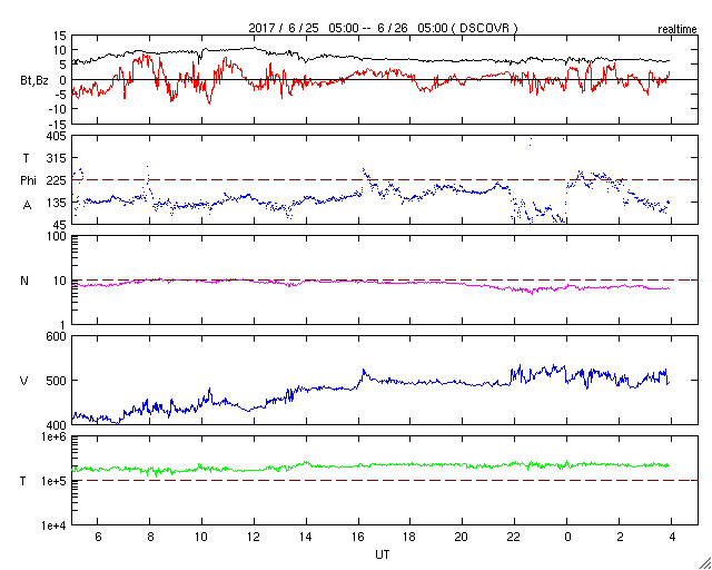 2017/ 6/26 13:05 更新 太陽風は高速風になり、磁気圏の活動もやや高まっています。カナダのオーロラをどうぞ。 担当 篠原 高坂雄一さんより、カナダのブリティッシュコロンビア州ランビーで、 現地25日1時(世界時25日8時、日本時間25日17時)に撮影された オーロラの写真をいただきました。 ランビーは、北緯50度と比較的緯度が高く、 北極圏には達していないので、夏至の頃でも空が暗くなり、 オーロラの活動が強まれば、オーロラの光を見ることができるようです。 昨日から今日にかけて、 太陽風の速度は420km/秒から500km/秒へゆっくりと高まり、 高速の太陽風が到来しています。 (速度が下がるのではと見通しを書きましたが、反対になっています) 磁場強度も、速度の上昇に先立って、6nTから一時的に10nTに高まり、 現在は6nTへ戻っています。 磁場の南北成分は、-5nT程度に南向きに強まる時間帯が見られ、 AE指数は、500〜1000nTの中規模の活動が数回発生しています。 高坂さんの撮影は、AE指数がちょうど1000nTのピークに達した頃です。 オーロラが輝いている地域から見ると、南の低緯度側に離れているため、 オーロラは地平線の近くで光っています。 低空の緑の光と、高い所の赤い光と、色合いがきれいに分かれています。 写真の右上には、(分かりにくいですが)カシオペア座が写っていて、 すぐ下、赤いオーロラの中に、二重星団がぼんやりと輝いています。 この地域は、オカナガン地方というそうですが、 気温も35度と夏になっているそうです。 見事なタイミングのオーロラの写真をありがとうございます。 太陽は、2664黒点群が中央に近づいていますが、 特に活動はなく、穏やかです。 また、中央部の南側に黒点が現れかけているようです。 見えるほどの大きさに発達するでしょうか。
