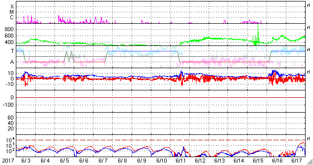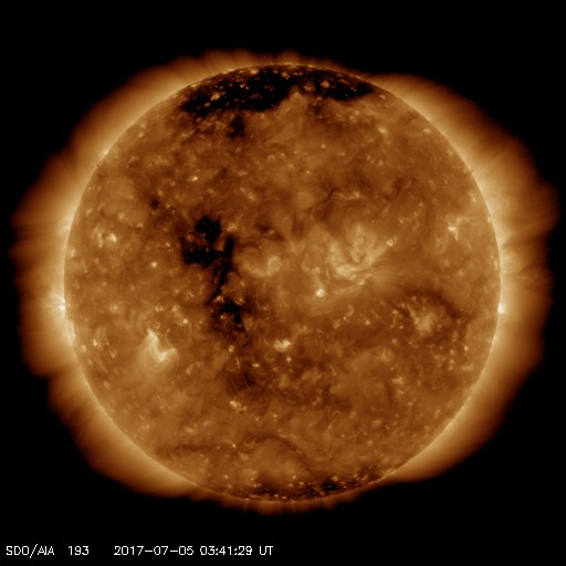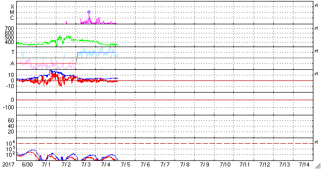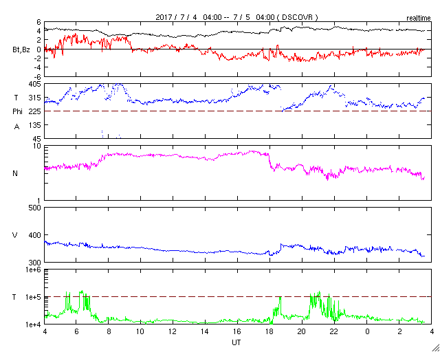 2017/ 7/ 5 12:47 更新 太陽風は330km/秒と低速になり、太陽も穏やかです。 担当 篠原 太陽風の速度は、330km/秒へ下がり、 低速の風になっています。 磁場強度は、3〜4nTとやや弱くなった状態で安定しています。 磁場の南北成分は、 グラフの前半は北寄り、後半は南寄りに変化していますが、 振れ幅は小さく、速度が下がっていることも重なって、 磁気圏は穏やかな状態が続いています。 SDO衛星AIA193では、赤道域のコロナホールは 明日くらいには中央線に達しそうです。 すると、4日後の7月9日頃から 太陽風への影響が始まるかもしれません。 太陽は、Mクラスフレアの発生した西の端で、 昨日の昼、4日13時(世界時4日4時)に、 C1.1の小規模フレアが起きていますが、 活動的な領域が向こう側へ進んだので、 現在は変化は見られなくなっています。 太陽は黒点も見えず、穏やかです。