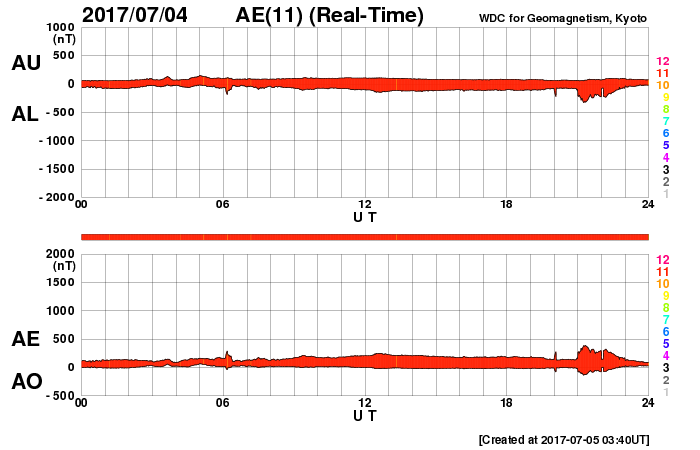 (c) 京都大学WDC ![]() 世界時7月5日のAE指数(速報値)。 (c) 京都大学WDC ![]() SDO衛星のAIA193カメラによる太陽コロナの様子 (c) SDO (NASA) ![]() SDO衛星による太陽の可視光写真 (c) SDO (NASA) ![]() DSCOVRが観測した太陽風の磁場(1番上の枠、黒線は全体の強度、赤線は南北成分) および、太陽風の密度(3番目の紫線)、速度(4番目の青線) (c) データ:NOAA/SWPC、作図:宇宙天気ニュース ![]() 27日の太陽周期に合わせたデータプロット 太陽が同じ面を地球に向けていた27日前の変化から、今後を予想することができます。 (c) 作図:宇宙天気ニュース